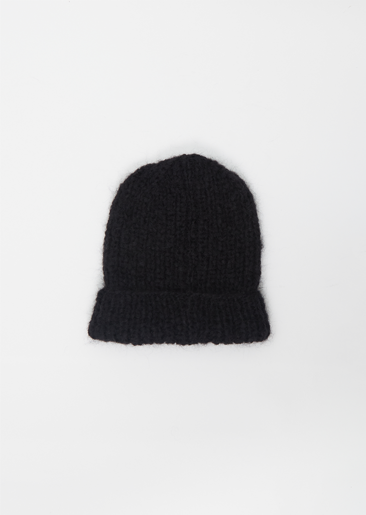 Casey Casey black chunky beanie hat hand-knitted in a soft mohair blend open stitch knit.
