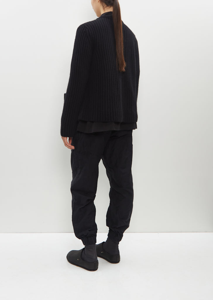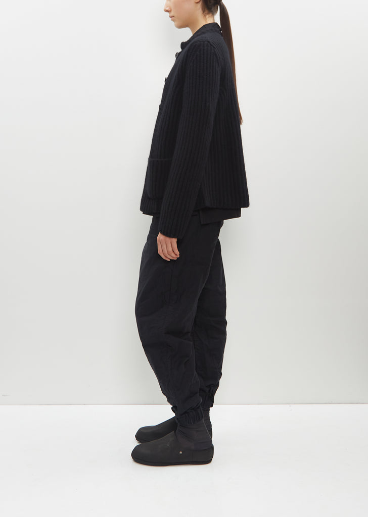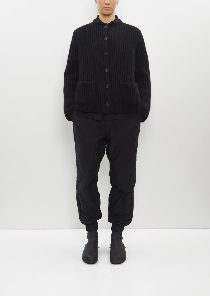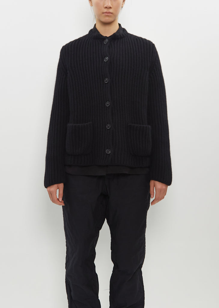 Casey Casey black cardigan with a band collar in virgin wool and angora blend. Features patch pockets at front and buttons closure. Finished with tonal corozo buttons.