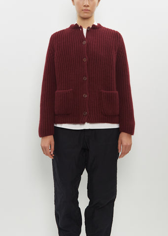 Casey Casey blackberry cardigan with a band collar in virgin wool and angora blend. Features patch pockets at front and buttons closure. Finished with tonal corozo buttons.