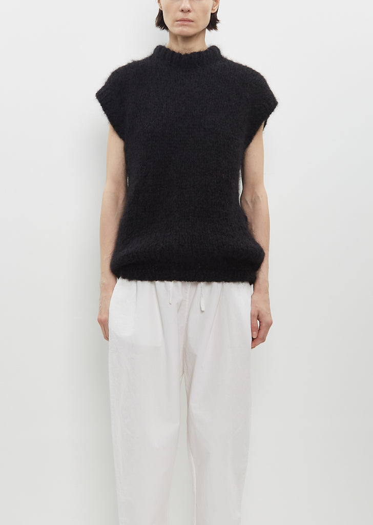 Casey Casey black relaxed sleeveless top handknitted in soft mohair blend open knit. Features dropped shoulders and ribbed neckline, arm holes, and hem.