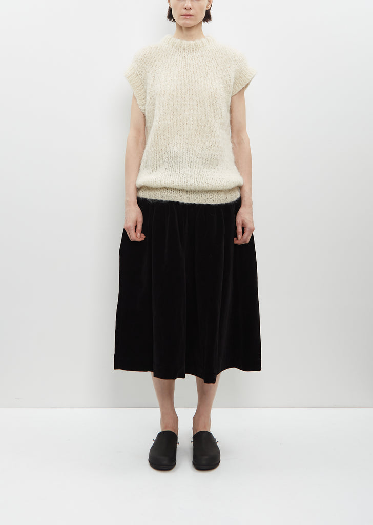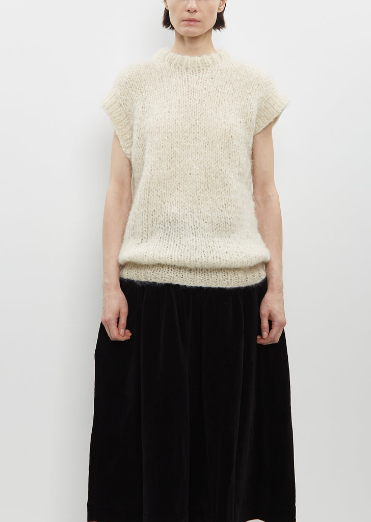 Casey Casey off white relaxed sleeveless top handknitted in soft mohair blend open knit. Features dropped shoulders and ribbed neckline, arm holes, and hem.