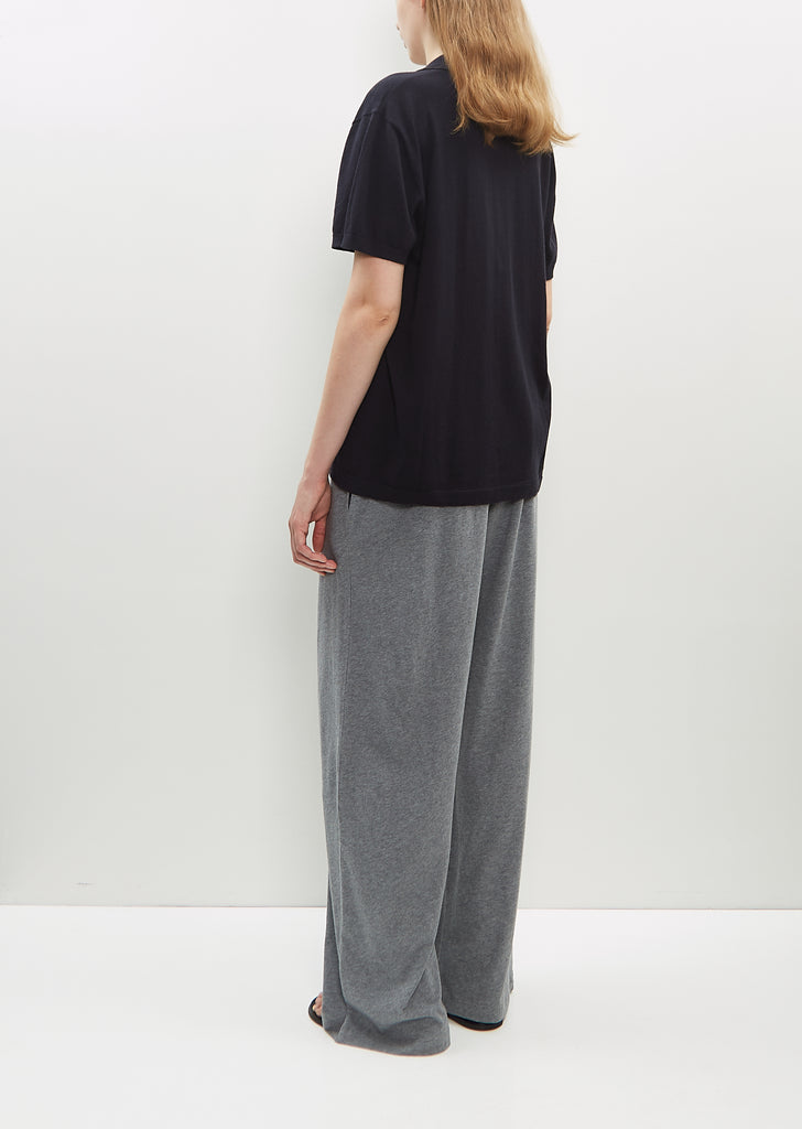 Extreme Cashmere navy short sleeves polo sweater with a spread collar and three corozo buttons closure in lightweight cotton and cashmere blend.