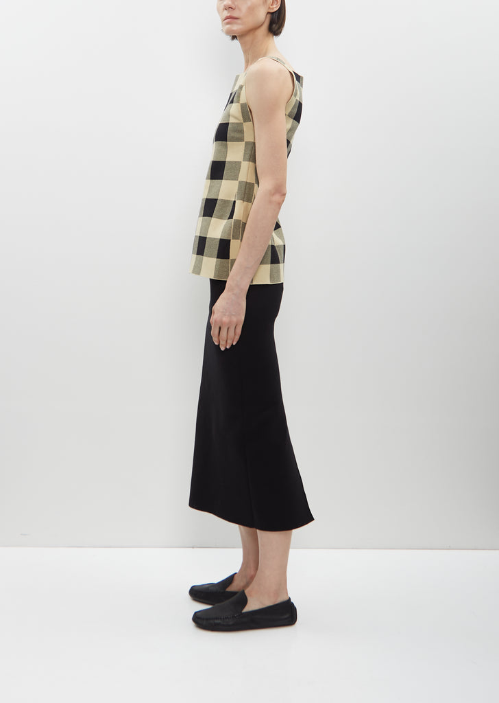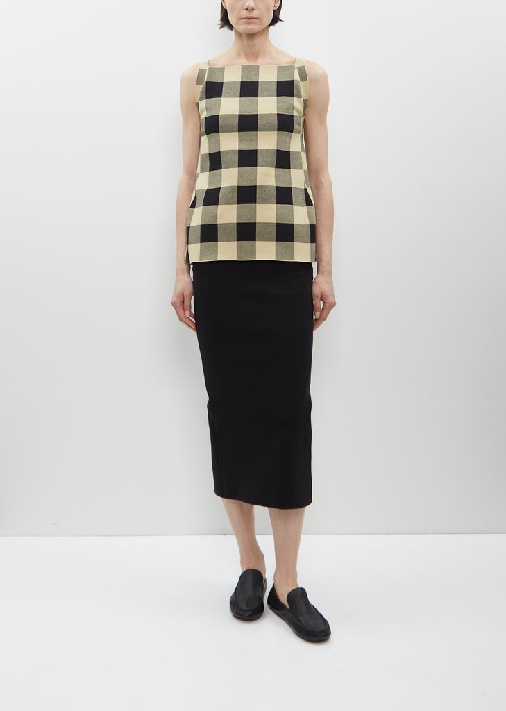 High Sport black and beige gingham sleeveless top with a slight peplum silhouette in soft cotton and lycra blend knit. Features a square neckline and side slits.