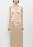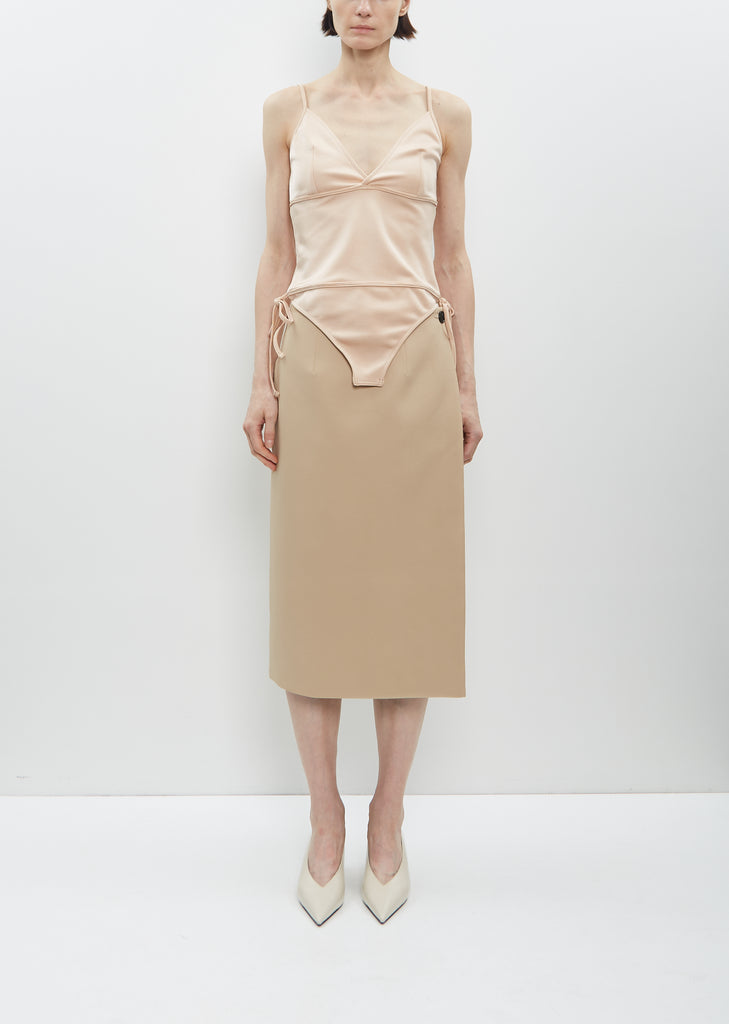 Marie Adam-Leenaerdt nude deconstructed top with a one-piece swimsuit shaped hem in elasticated nylon. Features a deep V-neckline, thin shoulder straps and adjustable side ties.
