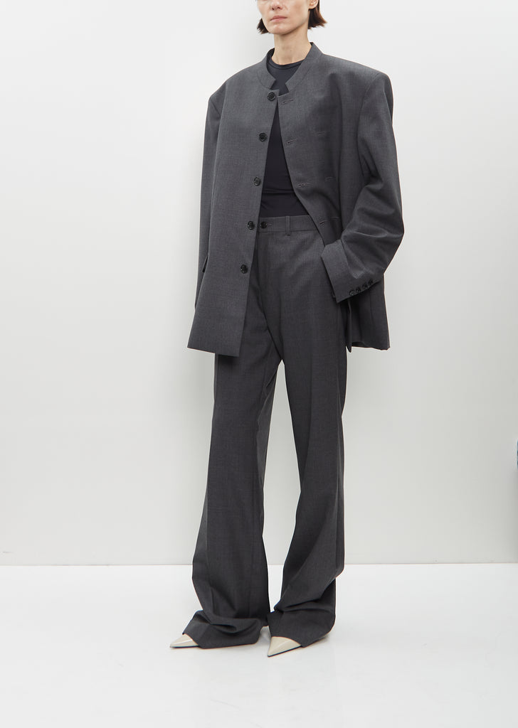 Marie Adam-Leenaerdt grey jacket with mao collar and pinched buttons front closure in wool twill. Features drop shoulders and welt flap pockets. Boxy silhouette with oversized fit. Lined in black cupro fabric.