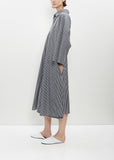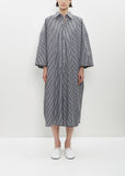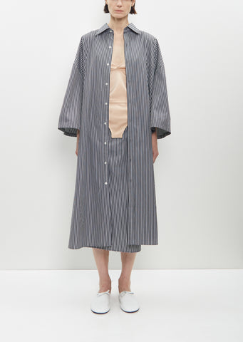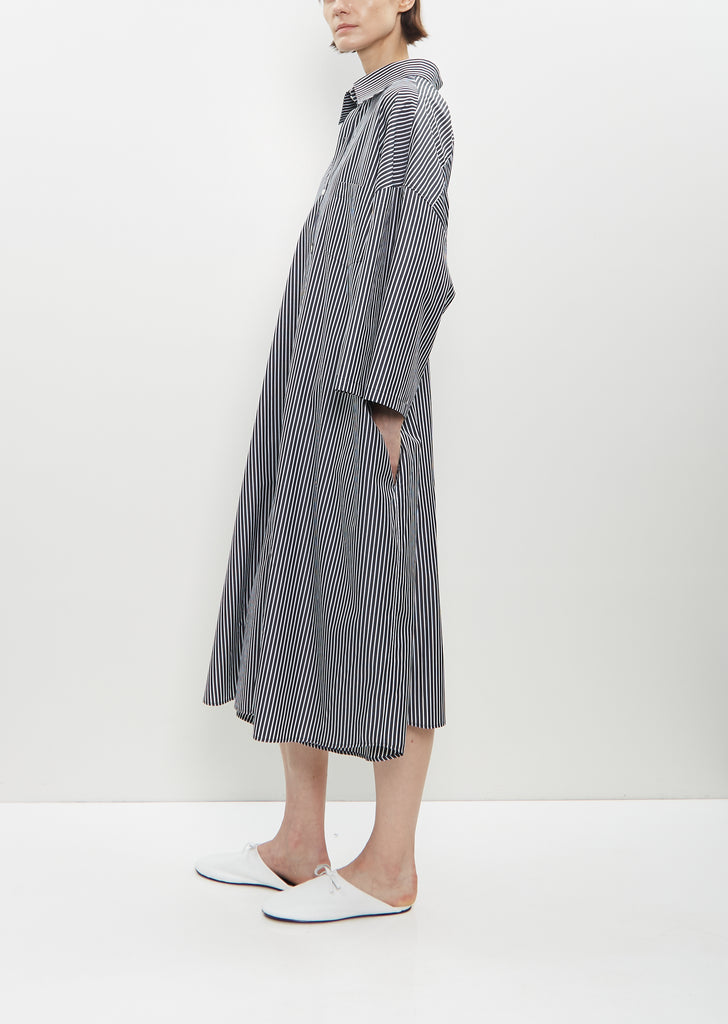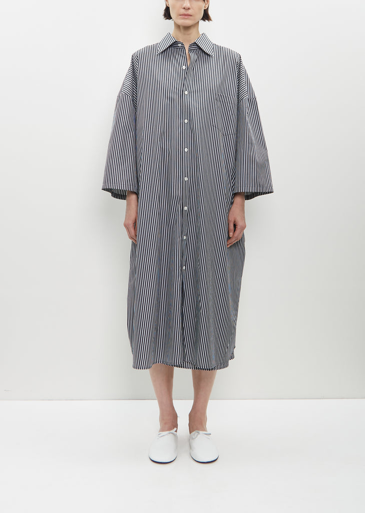 Marie Adam-Leenaerdt black and white stripes shirt dress with an integrated straight midi skirt in cotton. Features classic collar, kimono drop sleeves and a shell-hued buttons closure at front.