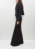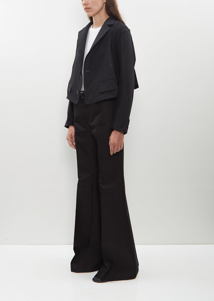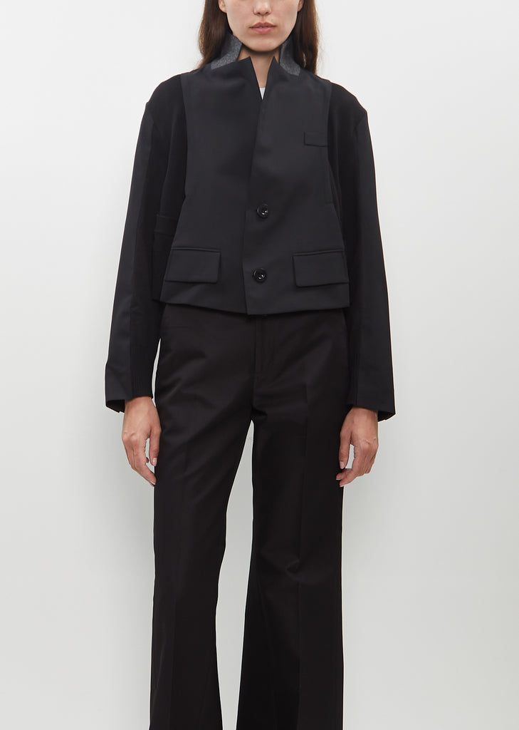 Sacai black paneled single breasted blazer with small flap pockets and notched lapels that can be worn as a stand collar with felted wool in cotton blend knit and wool blend twill. Features buttoned cuffs, a tonal buttons closure at front, three slits at back and rib trim at cuffs and hem. Collar can be worn Fully lined in soft tonal cupro fabric.