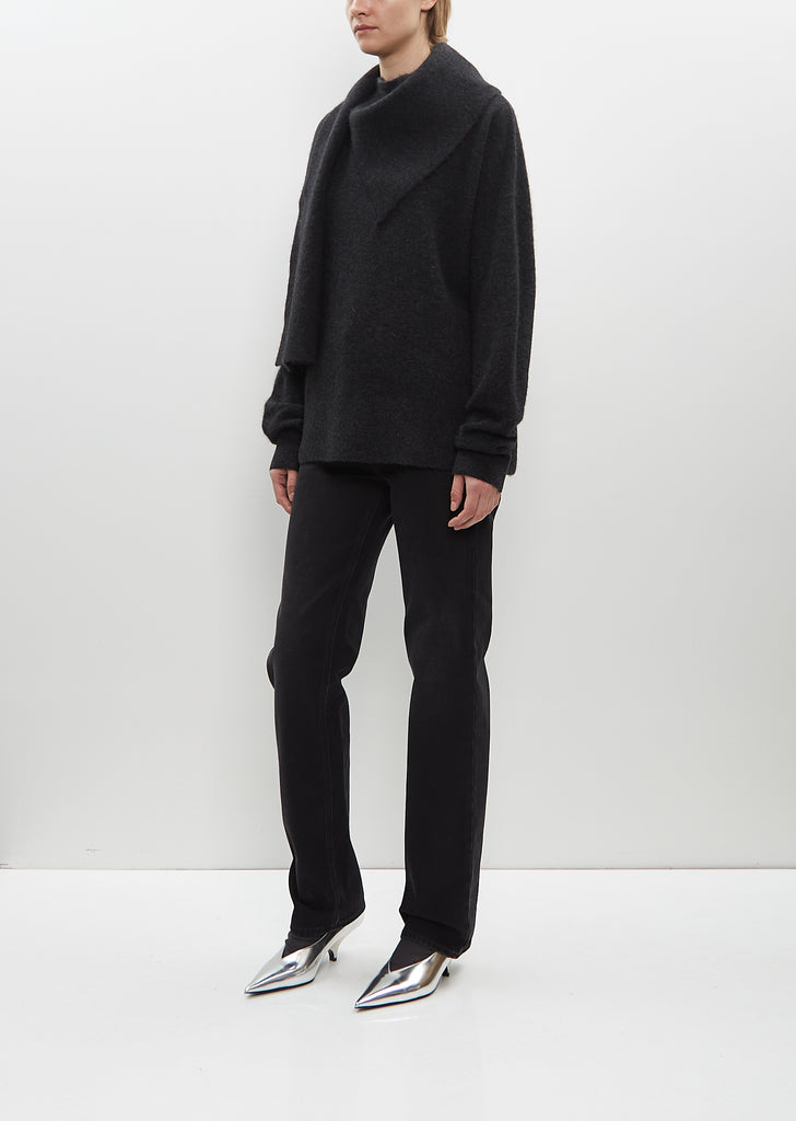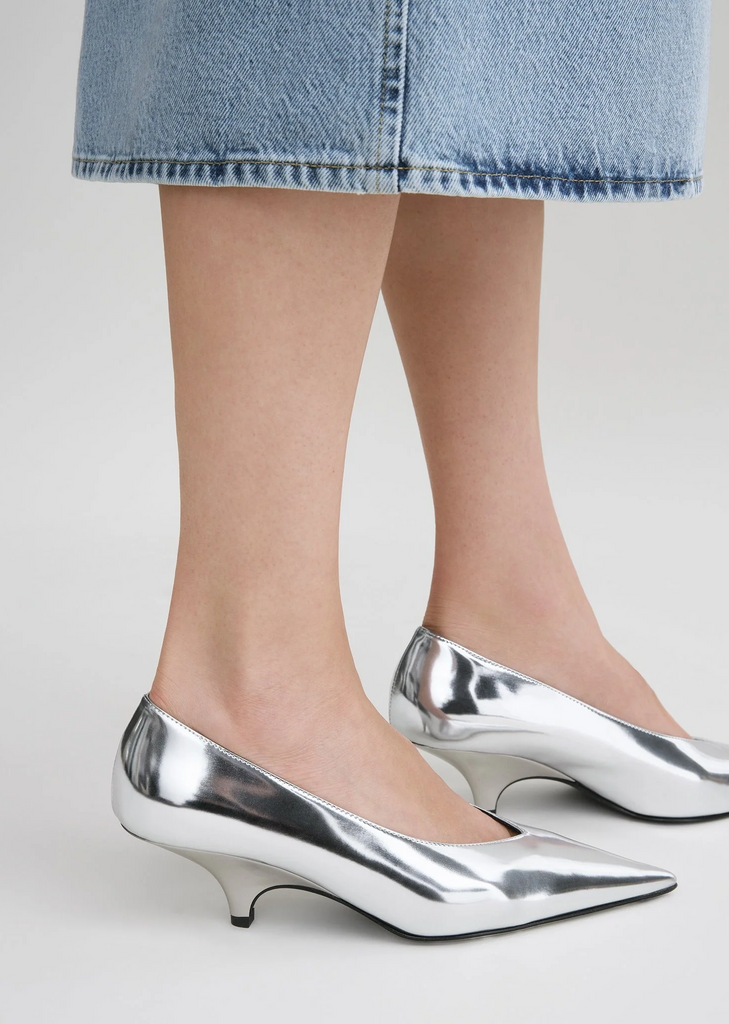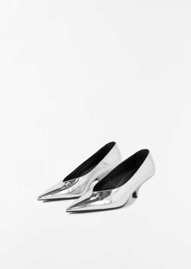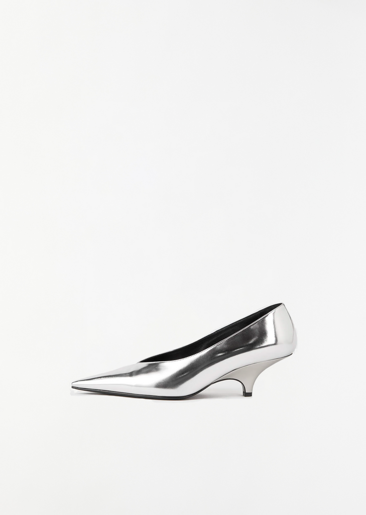 Totême silver pumps with pointed toe, V-cut vamp and a half wedge heel in shiny leather. Lined in smooth black leather.