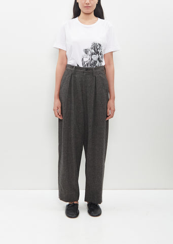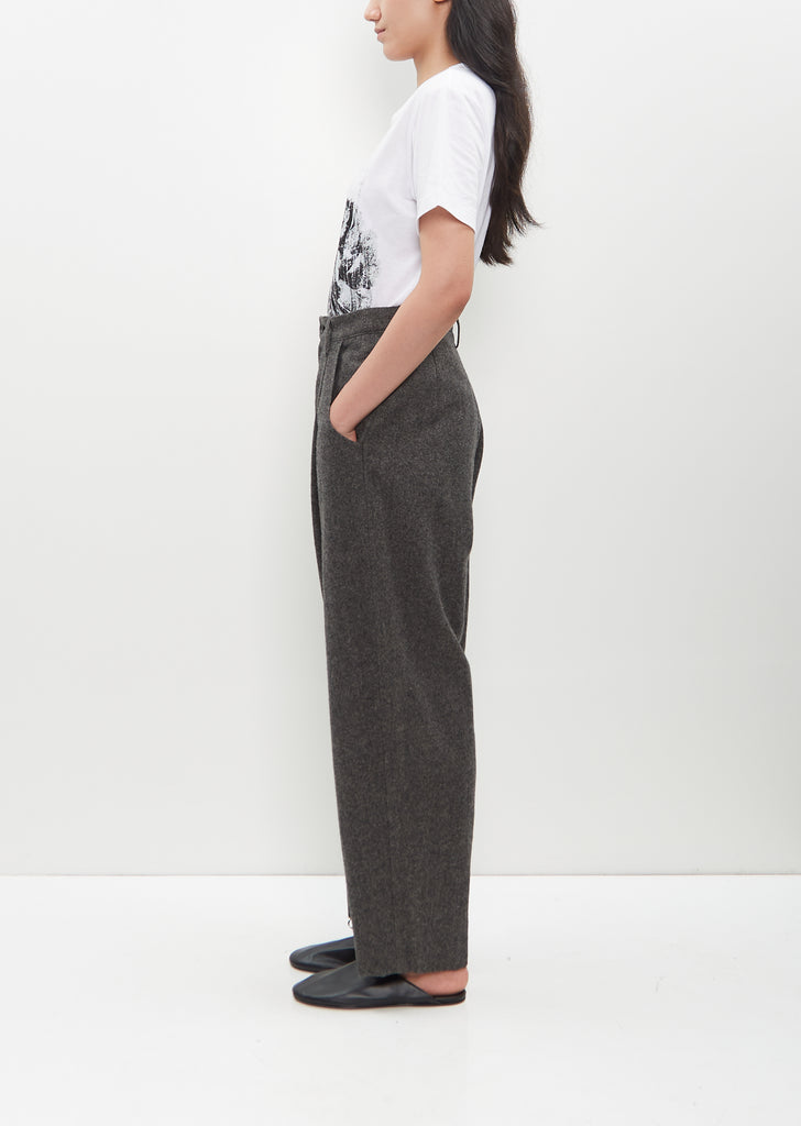Y's grey pleated pants with wide legs and curved slash pockets in washed wool flannel. Features belt loops and button and zip-fly fastening.