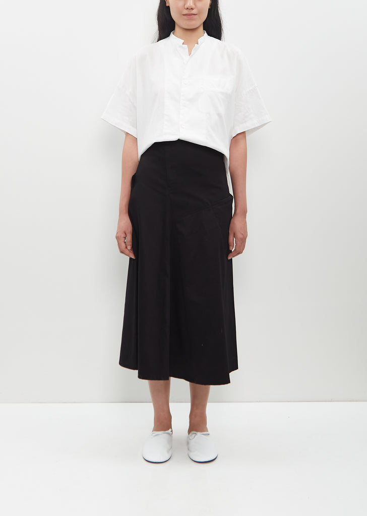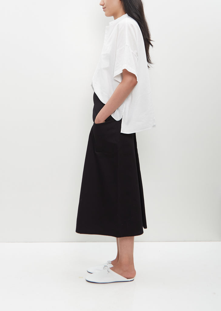 Y's black A-line skirt with a gusset at front and side patch pockets in cotton twill. Features adjustable side tabs, and a button and zip-fly closure at front.