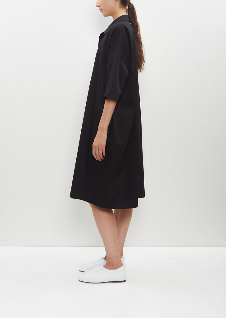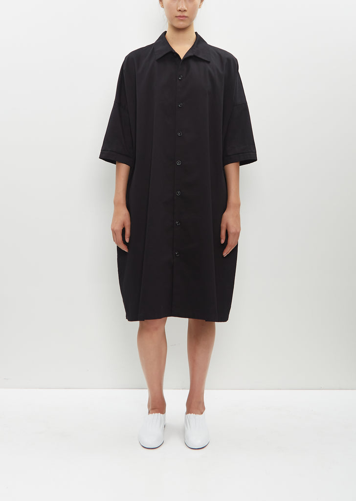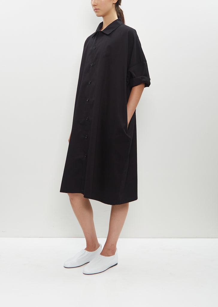 Y's black oversized shirtdress with cuffed short half sleeves and a spread collar in cotton twill. Features dropped shoulders and a tonal buttons closure at front.