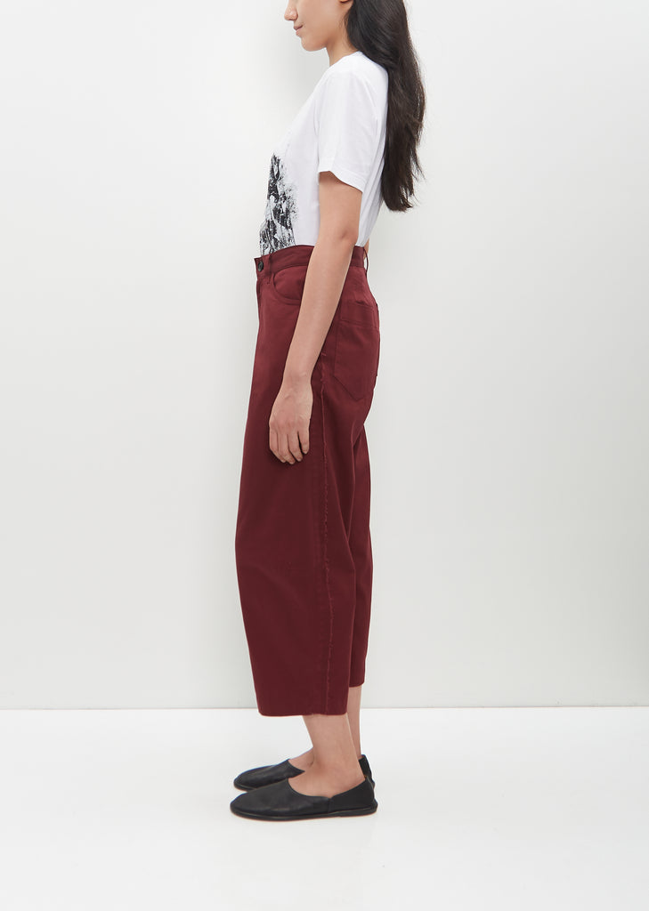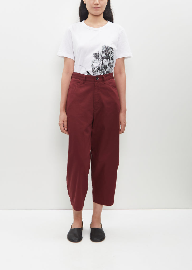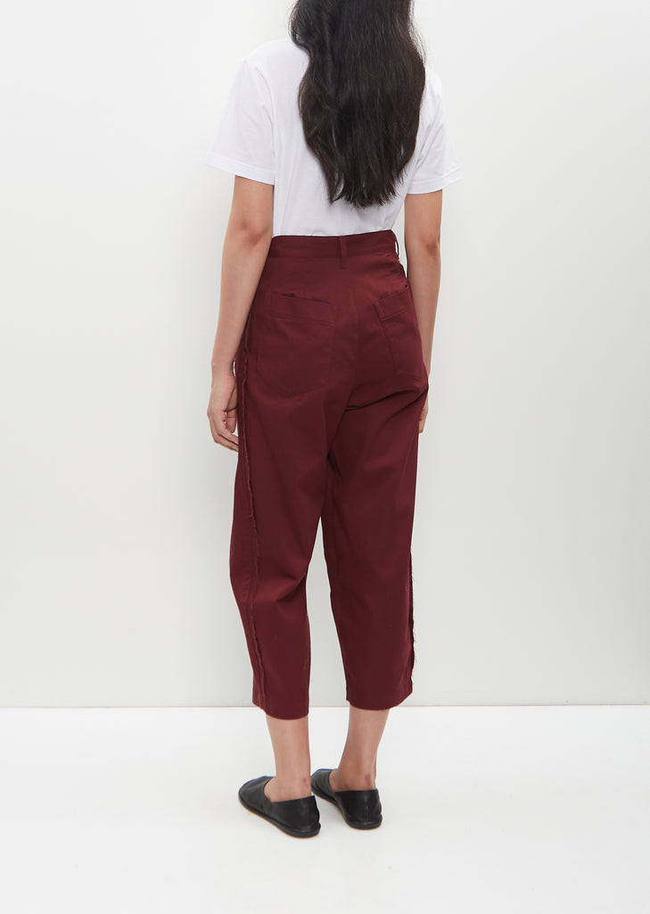 Y's bordeaux pants with a cut line at knee and raw finish side seams in cotton twill. Features belt loops, two angled pockets, darts at back waist, two patch pockets at back and a button and zip-fly closure.