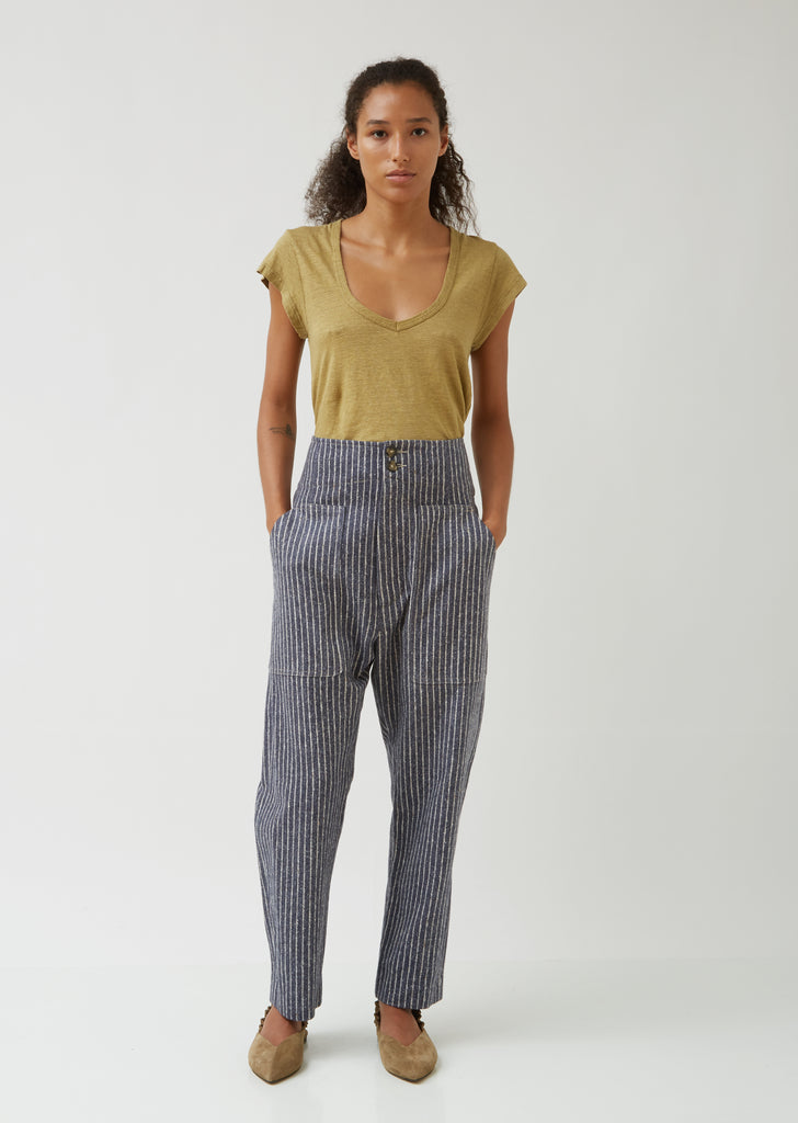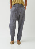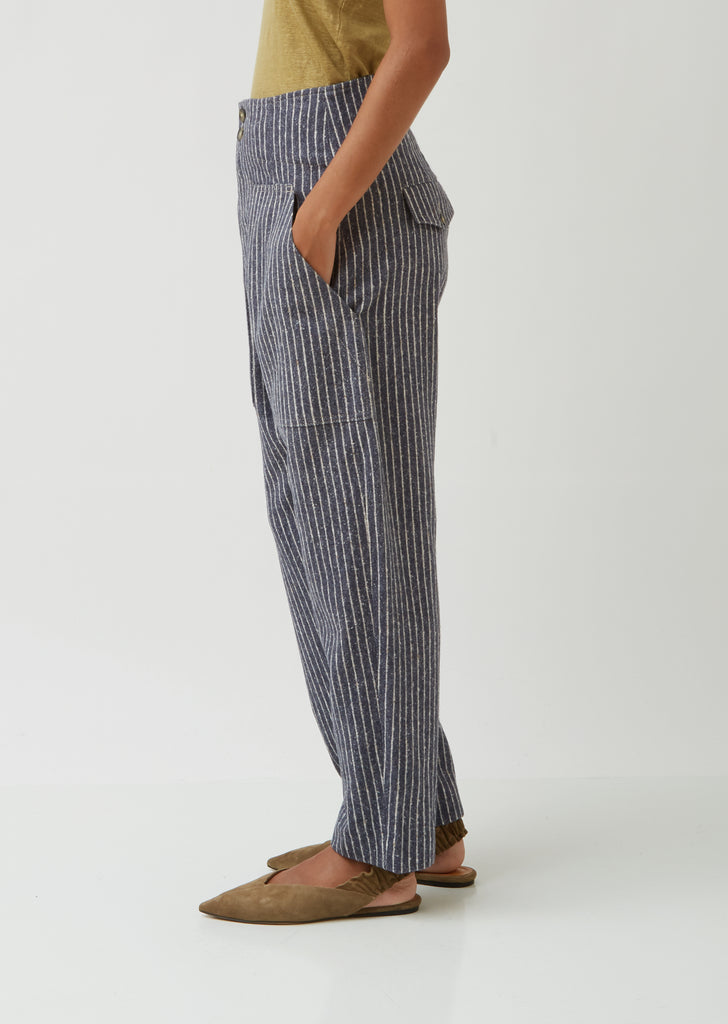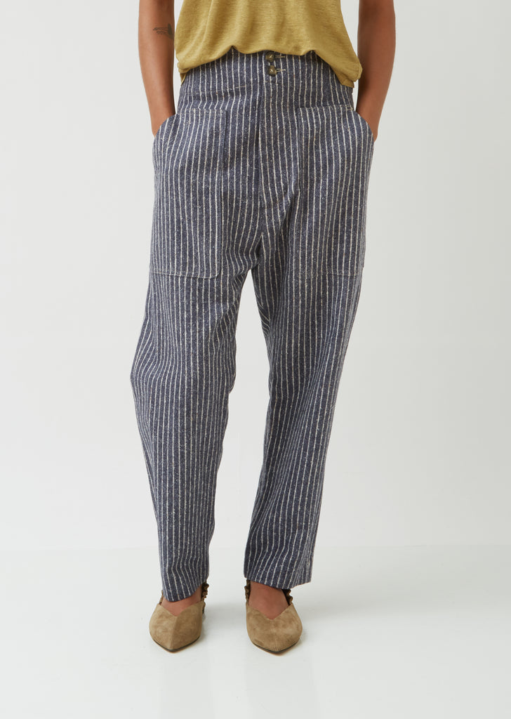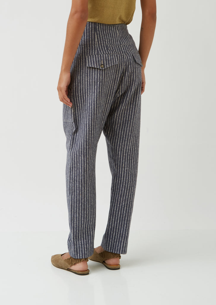 Blue-and-white-striped cotton-flannel trousers with utility pockets inspired by Japanese workwear. High rise. Two-button/zip closure. Two front pentagonal pockets. Two back welted pockets with button-through angled flaps. Cropped at mid-calf. Wide-leg fit.