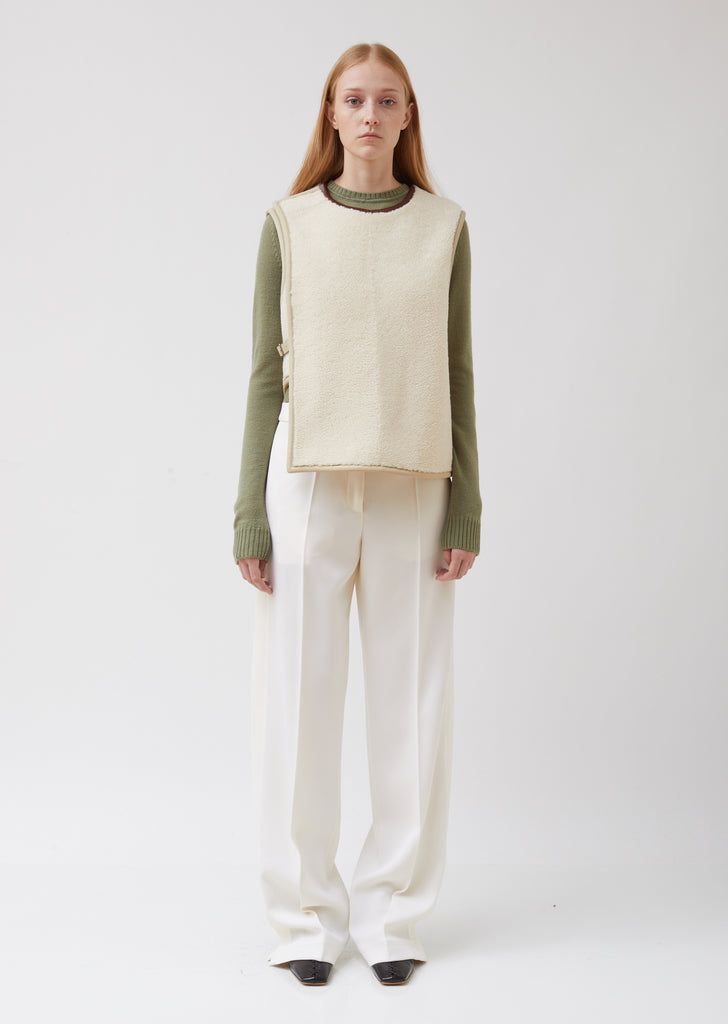 High-waist wide-leg trousers crafted from snow-white worsted wool. Set-on waistband. Concealed hook-and-eye/zip front fastening. Creased legs at front and back. Side slip pockets. Single welt back pocket. Darting at back waist. Vented cuffs with concealed snap-button closure. Full length. Relaxed fit.