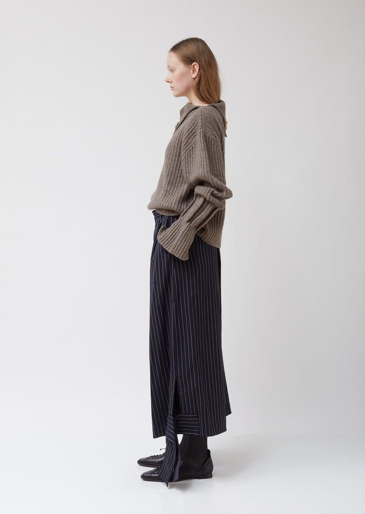 Cropped wide-leg trousers in a navy-and-white pinstripe-woven wool blend, finished with buttoned bow details at the cuffs. Mid-rise. Set-on waistband. Concealed hook-and-eye/button/zip closure. Belt loops. Dropped inseam. Slip pockets. Welt back pockets. Branded tonal buttons. Bow-detail straps can be styled multiple ways. Cropped at lower calf. Relaxed fit.