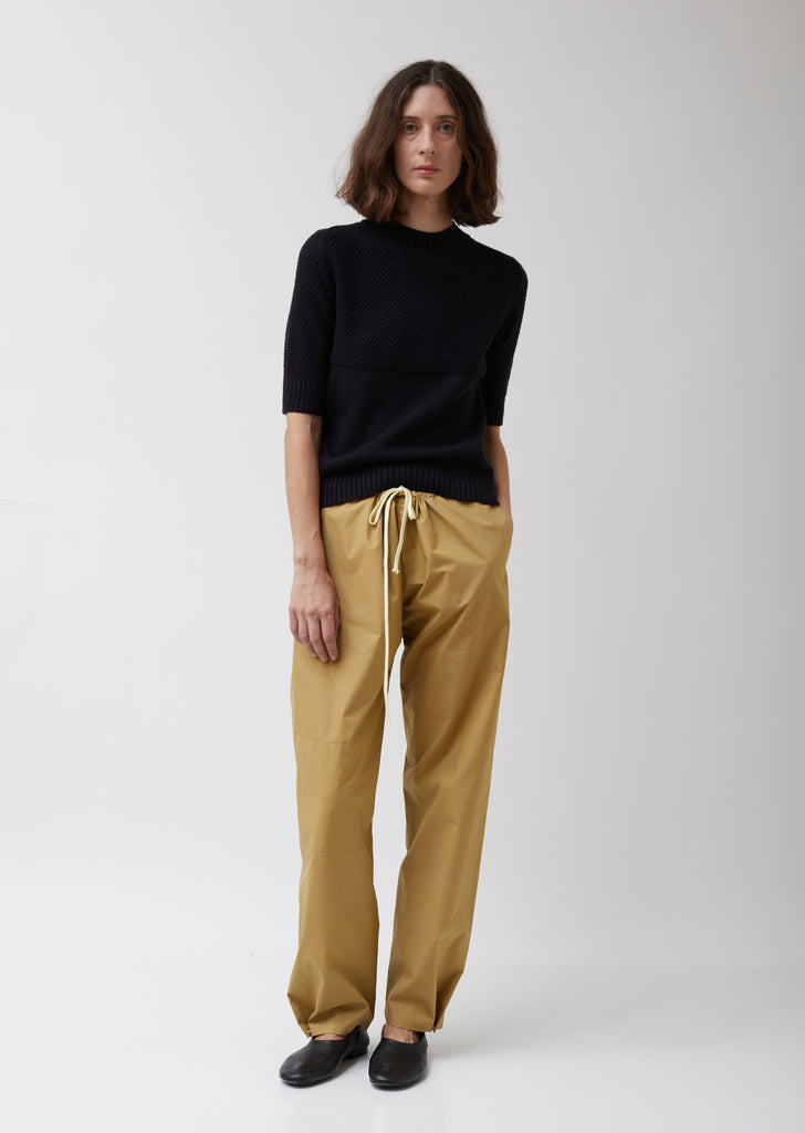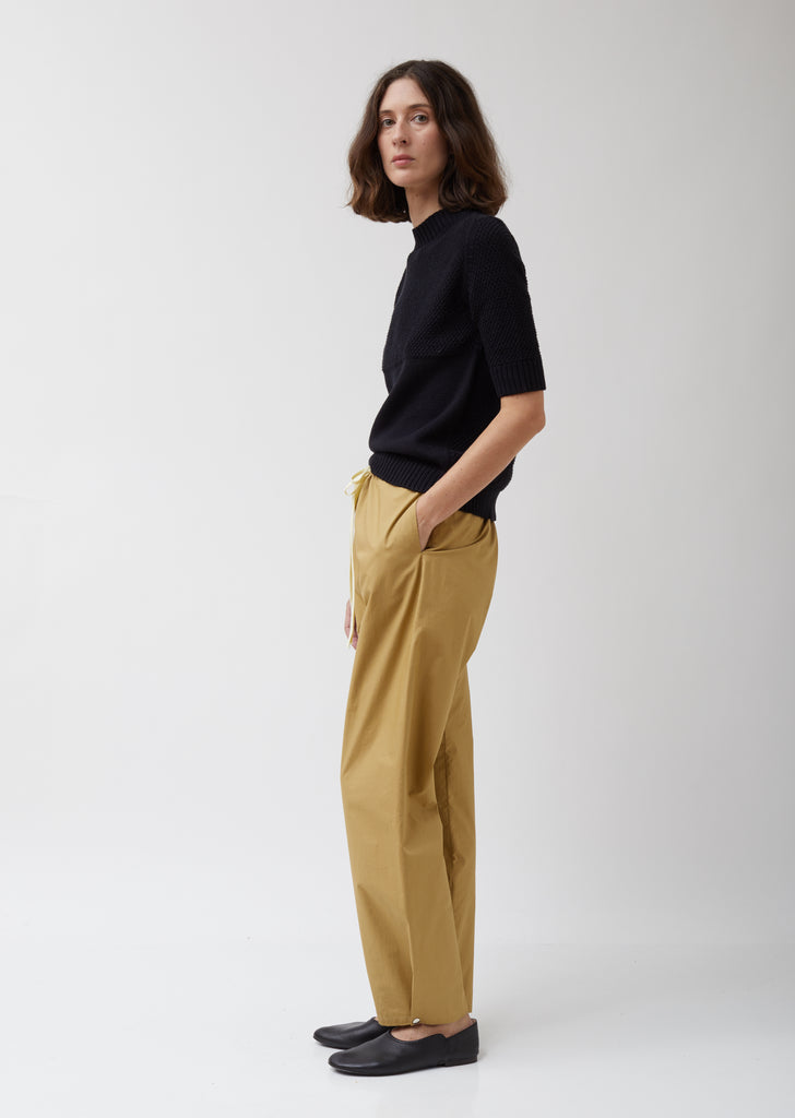 La Garçonne Moderne's signature Gallery pant updated in Green Cotton Broadcloth. Loose drawstring pants with tonal patch detailing at side. Relaxed, cropped fit. Side seam pockets. Back patch pocket.