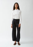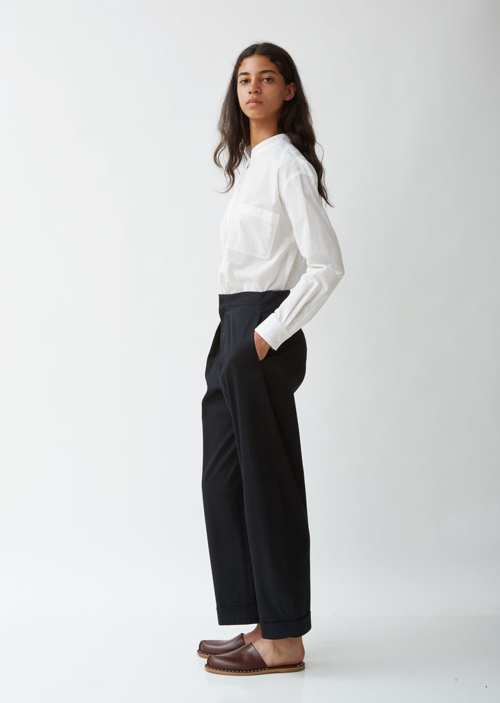 Signature Black Army trouser updated in a British cotton twill with slight stretch. Wide, tapered leg fit with clean, pressed cuffs. Clean waist finish with single topstitch detail all around and self facing inside waist. Concealed side pockets. Small welt pocket to one side. Single back pocket with flap. Hook & eye and zipper fly closure. Also available in Army.