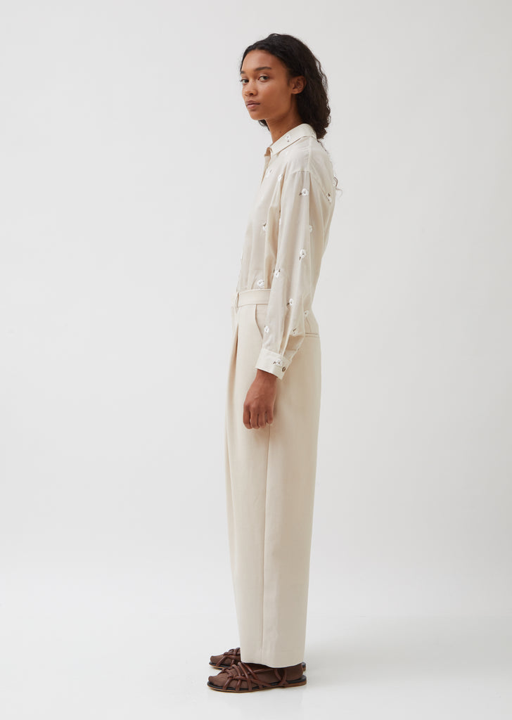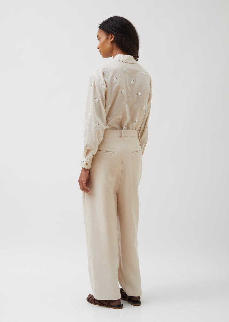 Wide-leg light-beige wool-twill trousers featuring released tucks at the waist and a tapered, cropped silhouette. Mid-rise. Banded waist. Belt loops. Hook/zip-fly closure. Side slip pockets. Rear welt pockets. Cropped just above ankle. Lined. Relaxed fit.