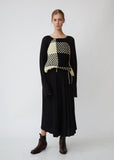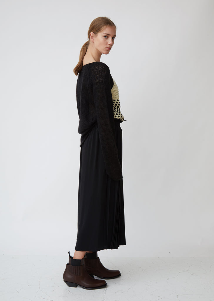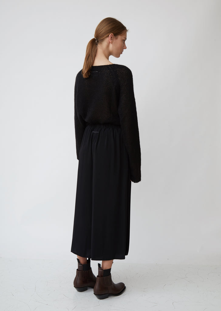 Knife-pleat wide-leg trousers with a midi-skirt silhouette—MM6's idea of two basics in one. Pleated front waist; elasticated at back. Contrast stitched-line Margiela "logo" below back waist. Cropped length. Color: Black. 100% Polyester. Dry Clean. Made in Italy.