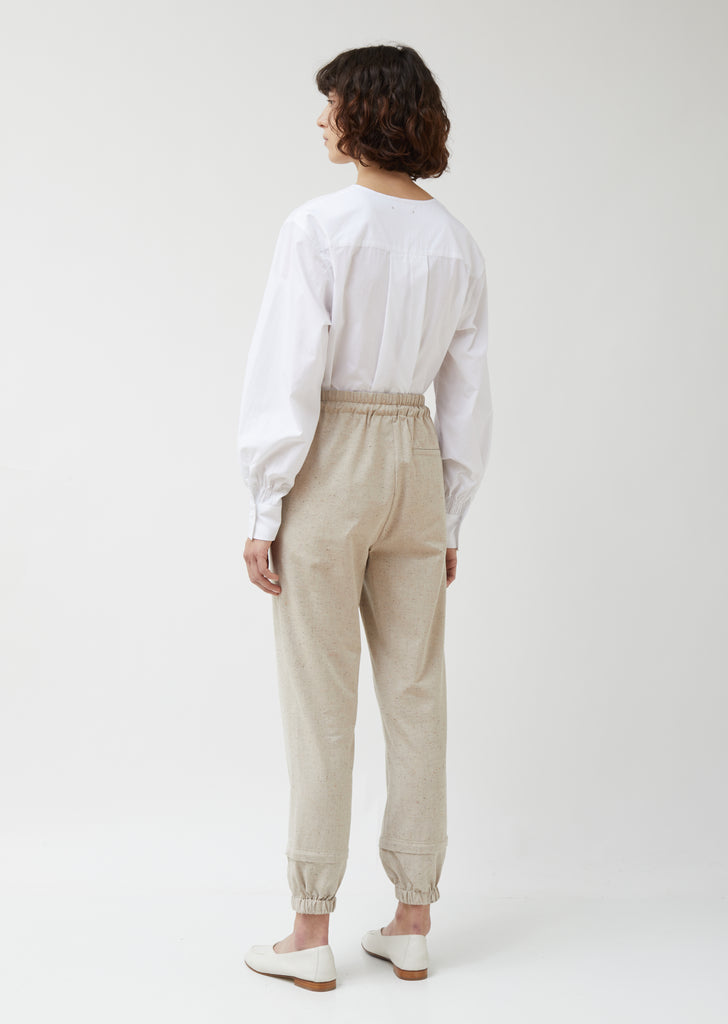 Black straight-leg pull-on trousers in mid-weight cotton/wool/slubbed silk/linen blend.  Removable tapered elastic cuff unzips to reveal a straight cropped hem. Two side pockets and one back pocket.  Drawstring closure with silver-tone hardware. Also available in Black.