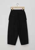 Noir by Kei Ninomiya’s pegged pants are crafted of black wool serge. They feature rectangular overlaid front pockets with welted openings, and the tapered wide legs are cropped at the lower calf.