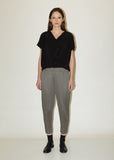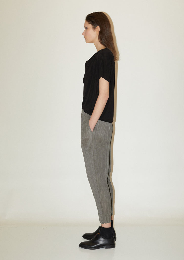 Signature pleated trousers by Pleats Please by Issey Miyake. Features a cropped length and tapered leg. Pull-on style. Tonal stitching.