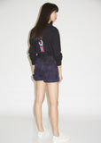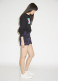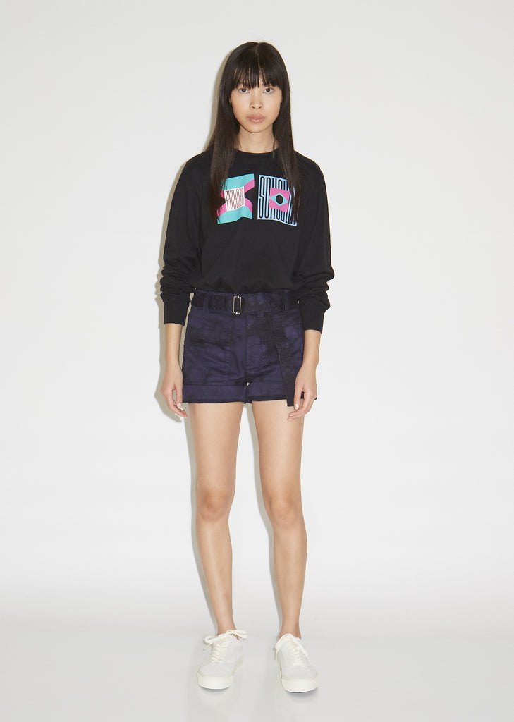 Utility-inspired cotton shorts with a black and dark blue ink hand bleached tie dye pattern. Designed with a high waist fit, utilitarian details include a belt at the waist and slouchy front pocketing, with silver hardware. Detailed with a concealed button fly, up turned hems, and large back pockets. Color: Ink / Black Tie Dye. 100% Cotton. Imported.