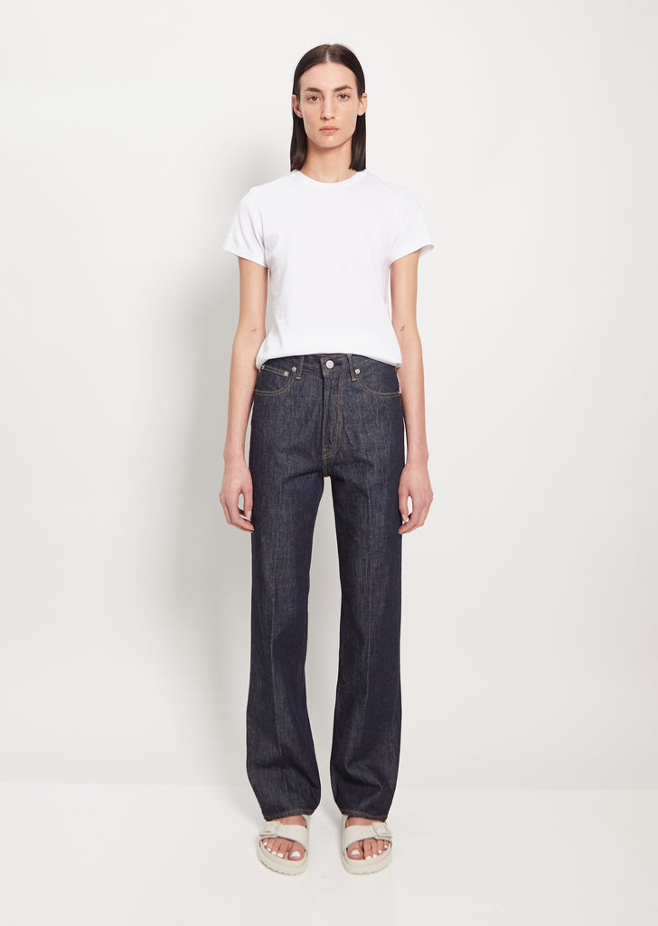 Auralee signature straight leg jeans in indigo cotton denim. High-rise fit. 5-pocket styling. Pressed creases at front legs. Brushed silver-tone button and zipper fly fastening.