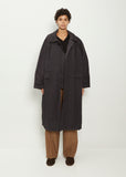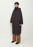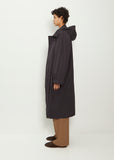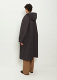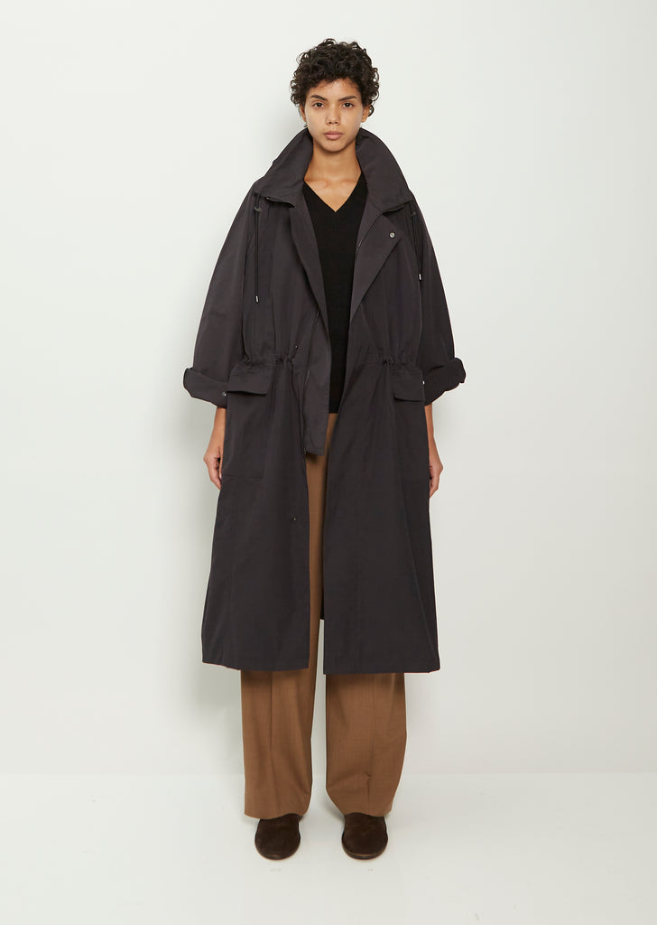 Auralee black oversized parka coat in water-resistant polyester cotton. Features two flap pockets, detachable hood, adjustable waist drawcords, and a front zip closure. Oversized fit. Unlined.