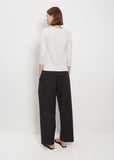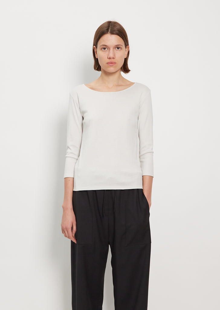 Crafted in Japan — La Garçonne Moderne rib tee with a wide scoop neckline and 3/4-length sleeves in fine ribbed cotton jersey. Finished with a banded trim at neckline. Relaxed, slim fit.