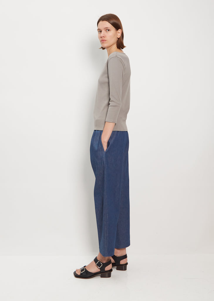La Garçonne Moderne pull-on trousers with elasticated waist in mid-weight Japanese denim. Hidden side pockets. Tapered, cropped legs.