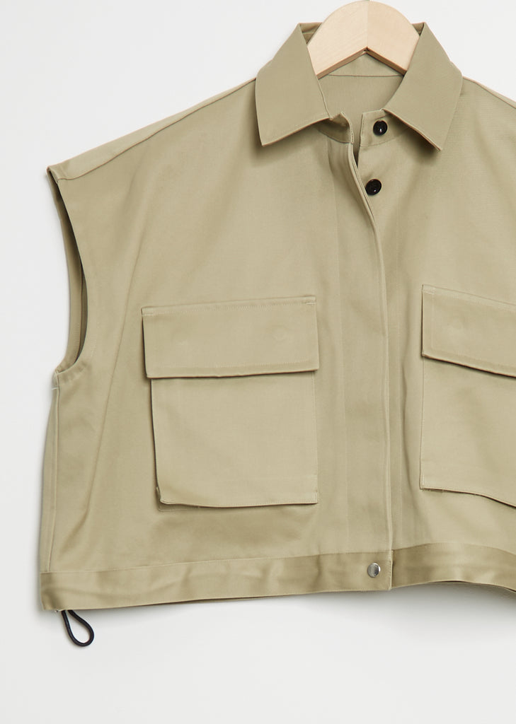 Sacai beige oversized cropped sleeveless shirt in cotton chino. Features two chest pockets, adjustable waist cinch toggles, and button front closure with silver snap on hem. Boxy fit. Can be worn as a top or open as a vest. Lined in self.