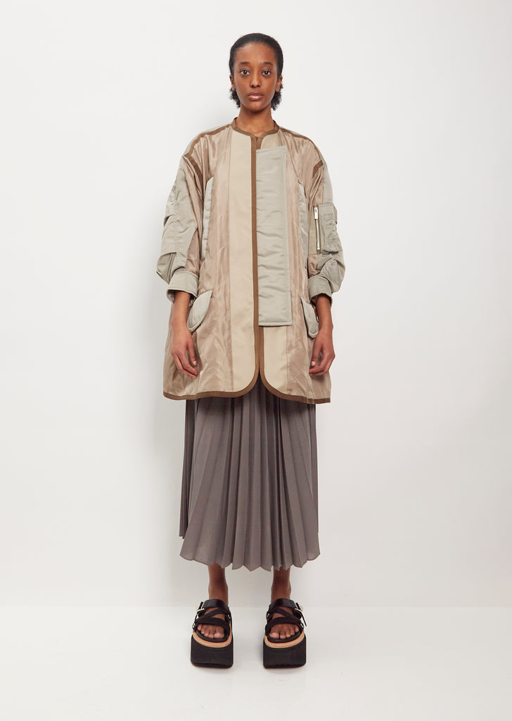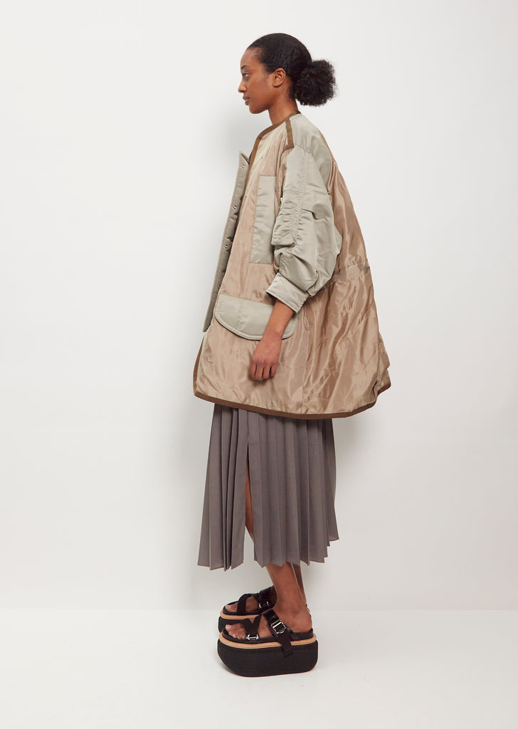 Sacai beige quilted jacket with cinched puff sleeves in nylon wool. Features contrast piping along seams, two angled chest pockets and two patch pockets. Zipper closure with snap fasteners and storm flap. Fully lined. Boxy fit.