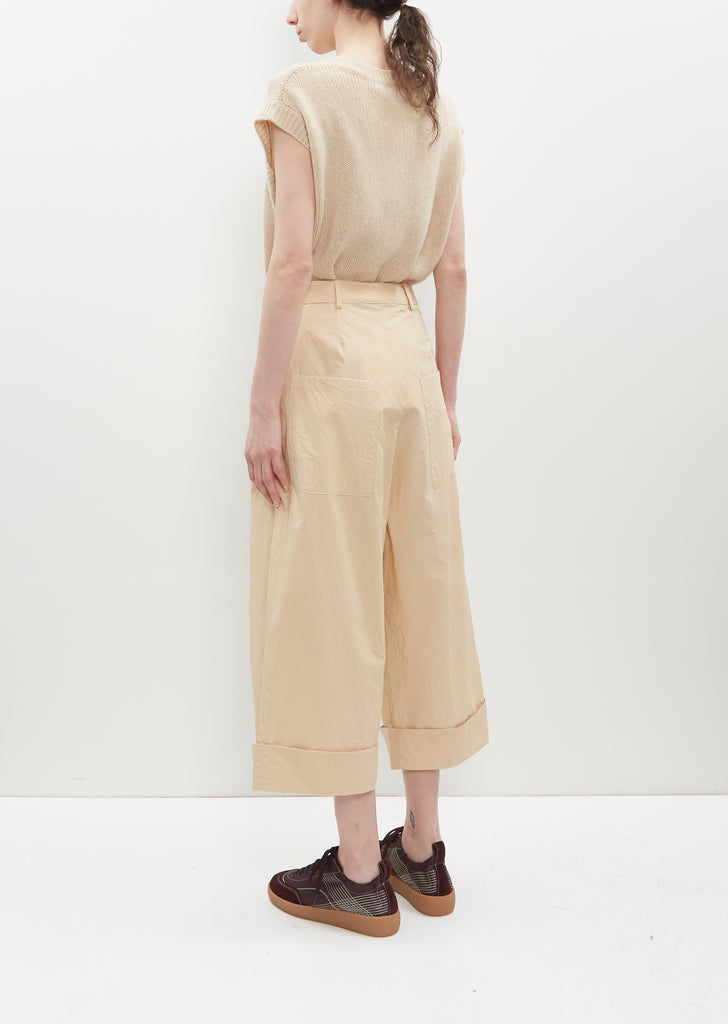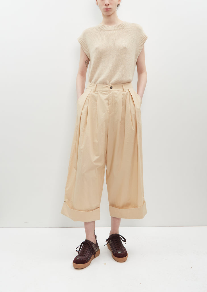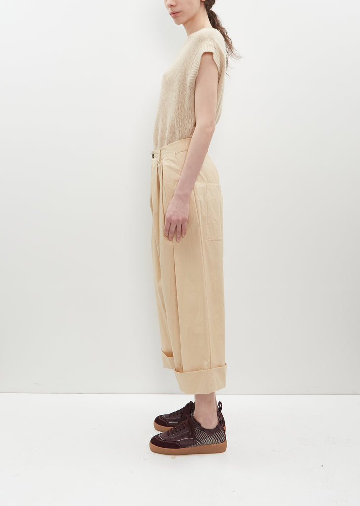 Apuntob honey beige pleated pants with cropped wide legs in lightweight cotton poplin with a crinkle effect. Features angled side pockets, back patch pockets, cuffed hems and a horn hued button and zip fly closure.