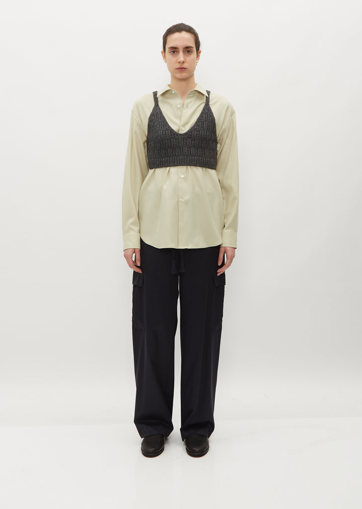 Auralee charcoal grey cropped camisole with a v neckline knit in pure corded wool. Pullover fit.