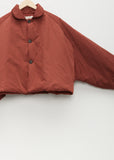 Eleph red brown short puffer with a stand collar in padded crepe. Straight silhouette with a regular fit.