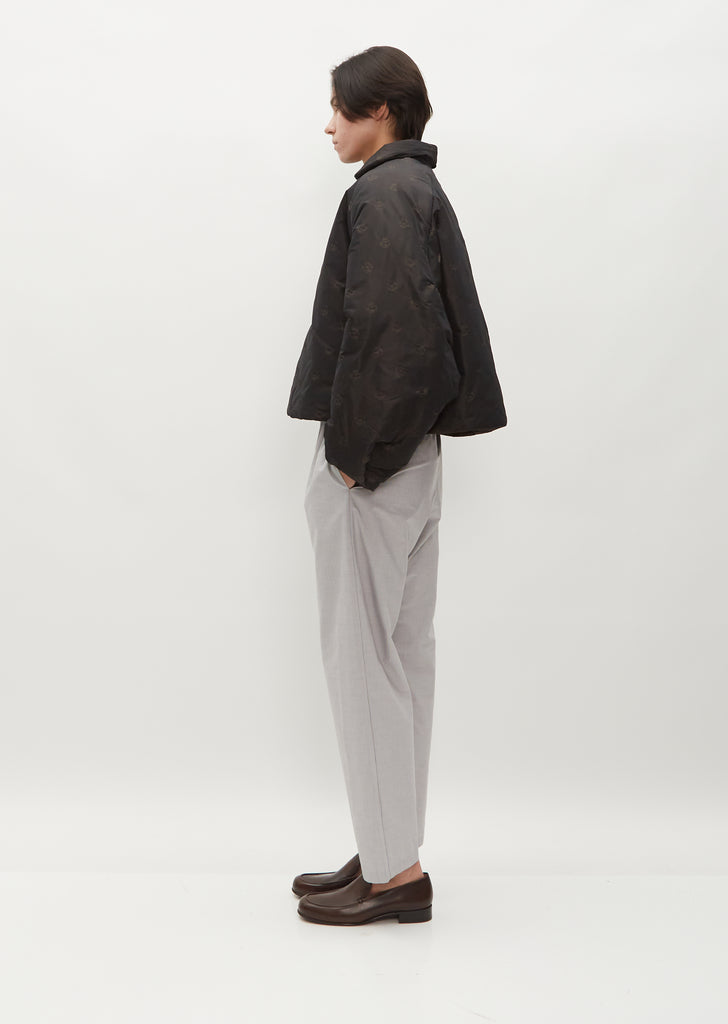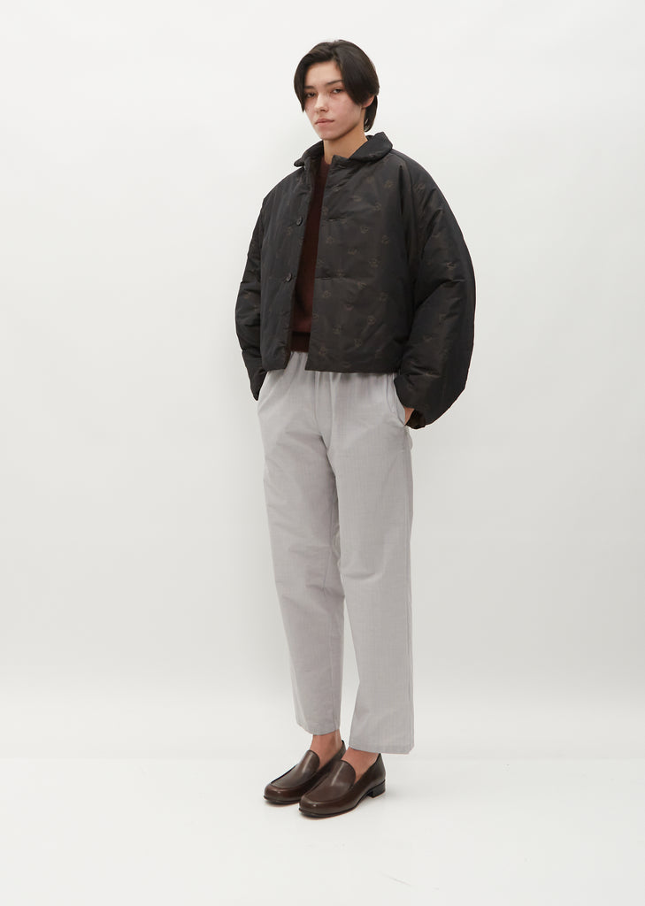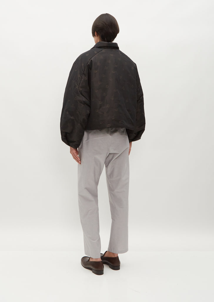 Eleph black short puffer with a stand collar in padded flower jacquard crepe. Straight silhouette with a regular fit.
