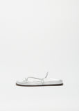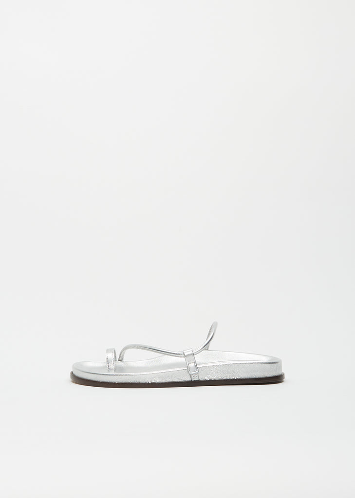 Emme Parsons silver slide with a toe strap and leather cord across vamp in soft nappa leather. Features a round toe, covered elastic at side, a lightly padded welted leather footbed, a leather sole and stacked heel.