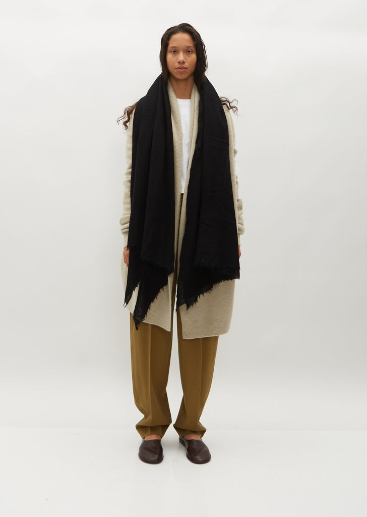 Frenckenberger black woven scarf with a square shape in loose gauge lightweight cashmere. Finished with raw edges at all sides.