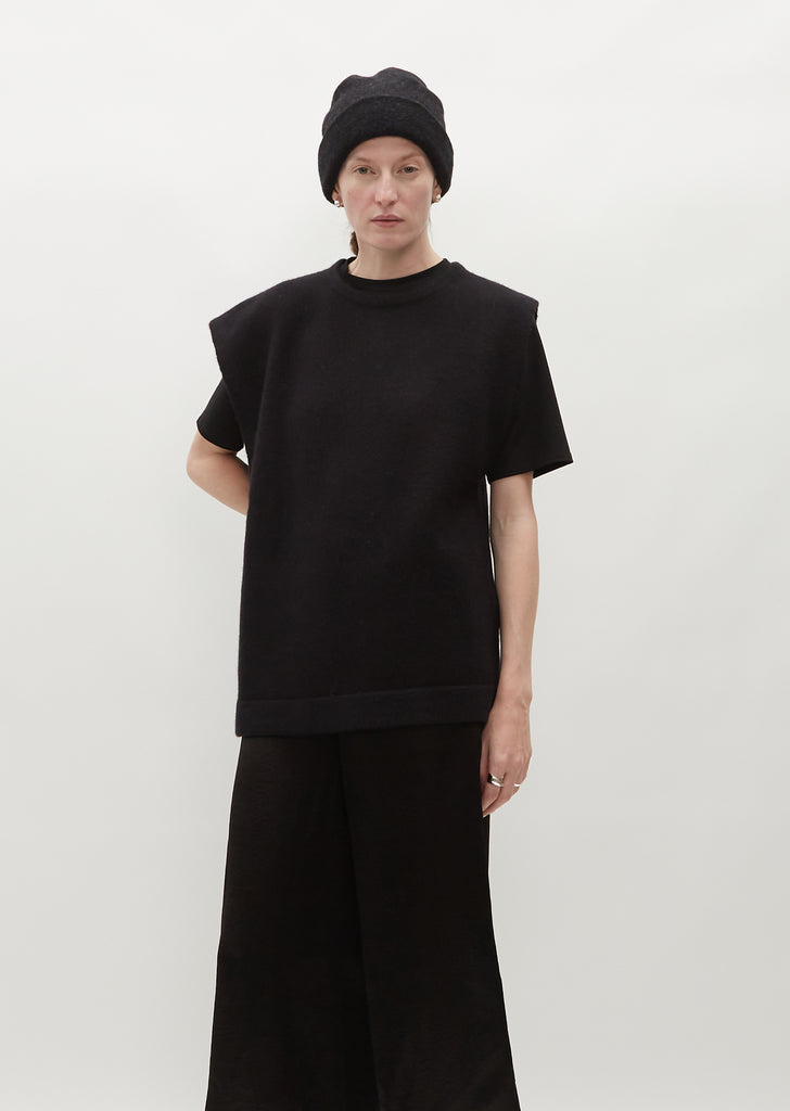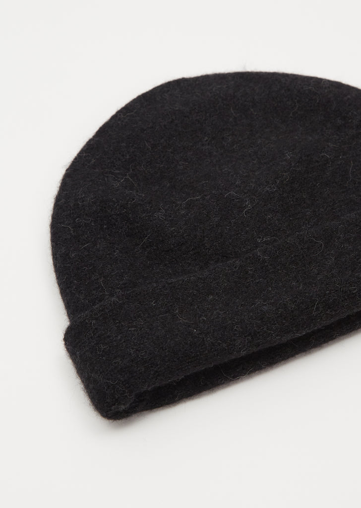 Lauren Manoogian black melange double layer seamless beanie handloomed in lightweight soft finest grade baby alpaca and cashmere blend.