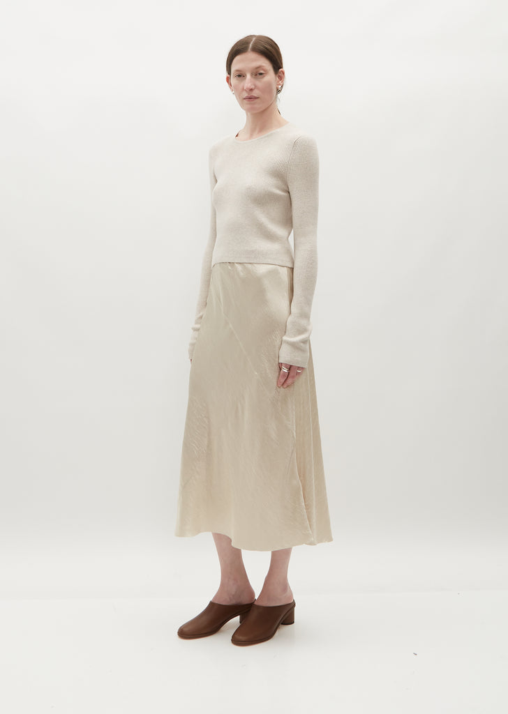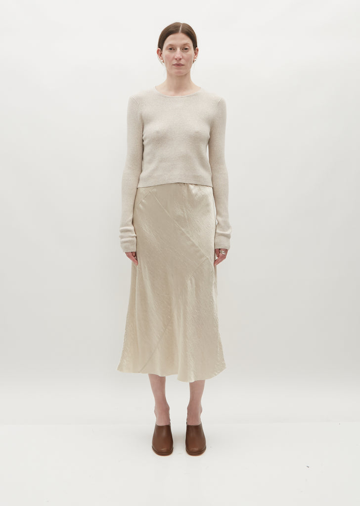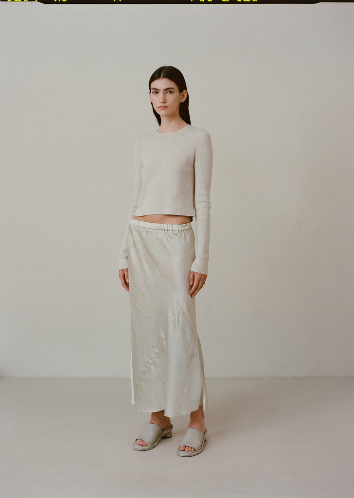Lauren Manoogian oyester midi skirt with bias drapes in lightweight soft sheen rayon. Slightly A-line silhouette with a closer fit.