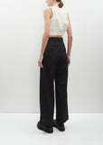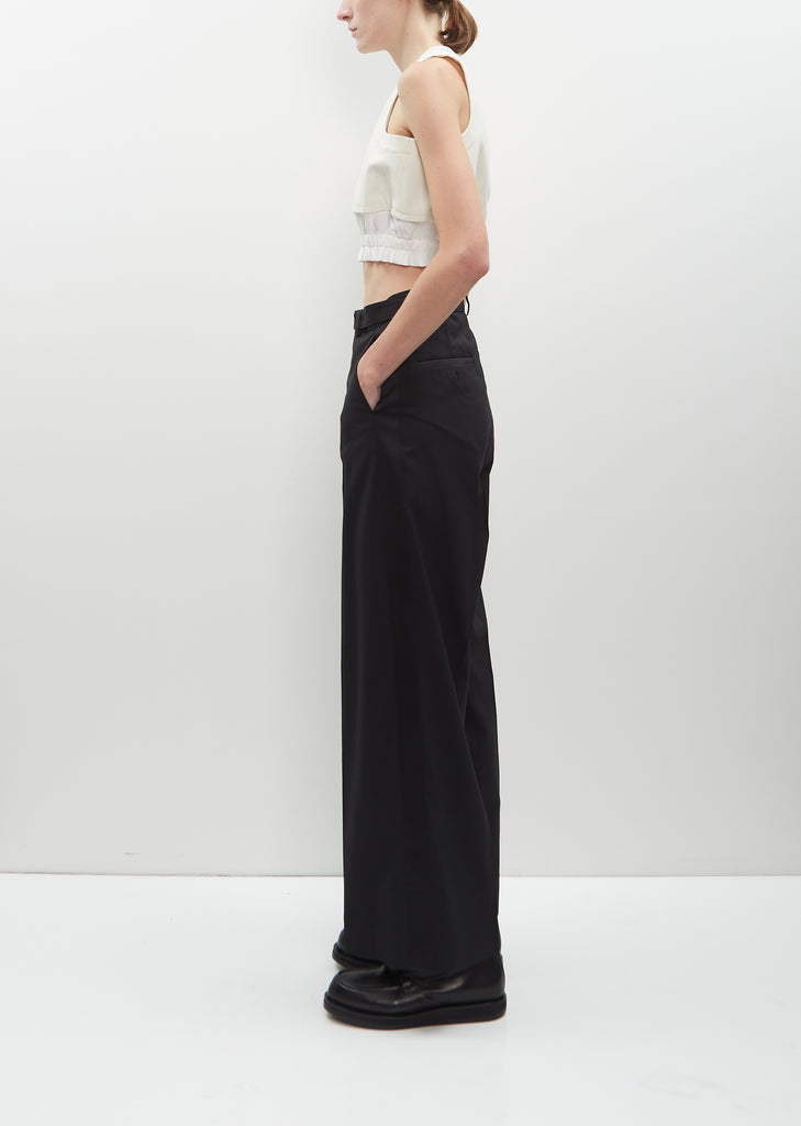 Sacai black signature pleat front suit trouser with wide legs and self belt and a wool blend suiting fabric.