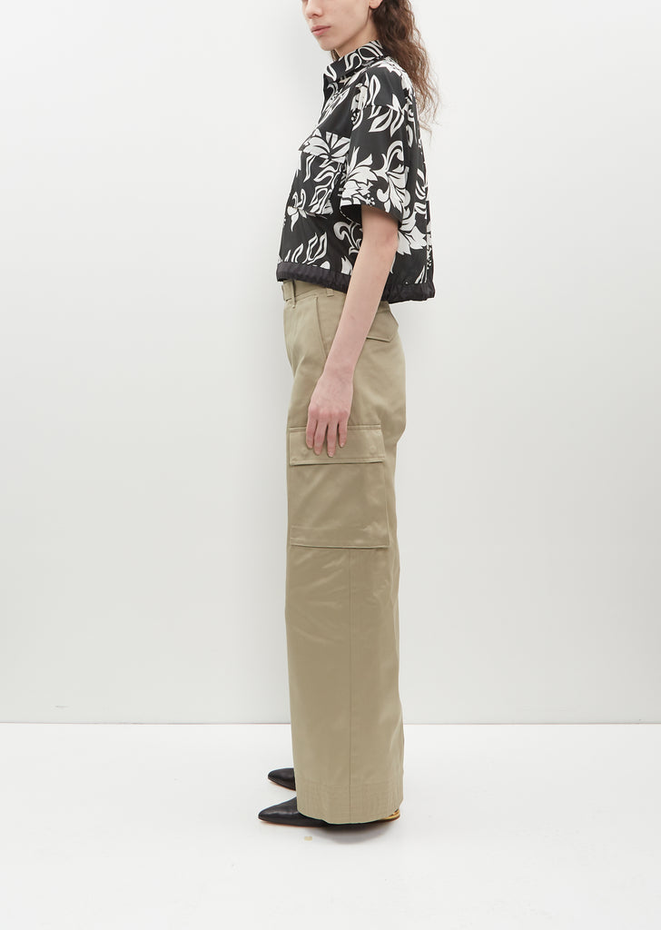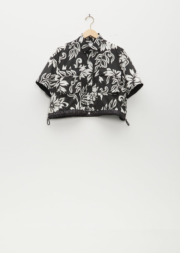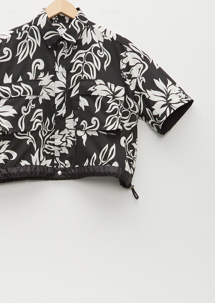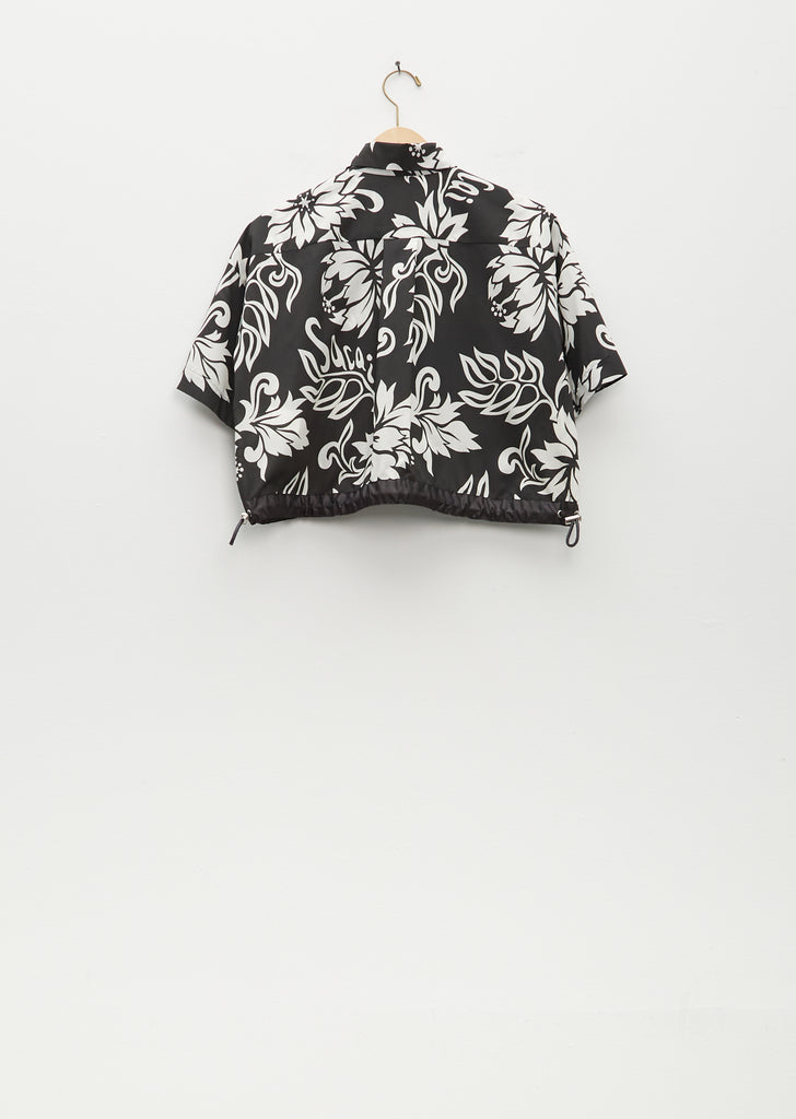Sacai black floral printed cropped shirt with adjustable waist toggles in lightweight crepe. Boxy silhouette with a slightly oversized fit.