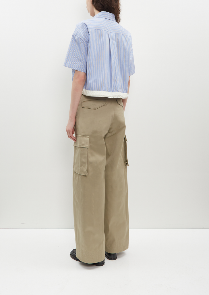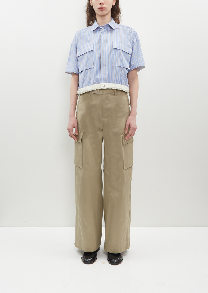 Sacai light blue and white collared short sleeve shirt with front flap patch pockets and adjustable grosgrain hem in cotton denim. Finished with button closure at front with silver-tone snap detail.