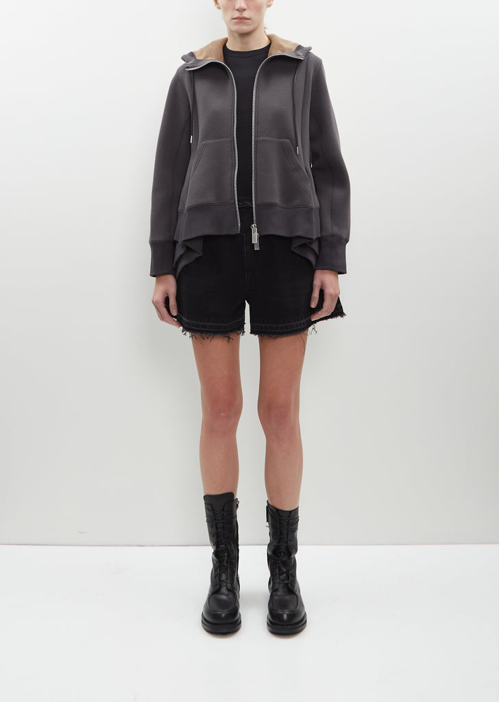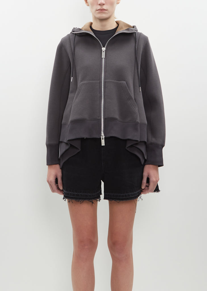 Sacai charcoal grey hooded sweatshirt with a handkerchief asymmetrical hem and an exposed zip closure in signature sponge sweat jersey. Features adjustable hood drawstrings with metal ends, angled pockets at front and a rib trim finish at sleeve cuffs and hem.