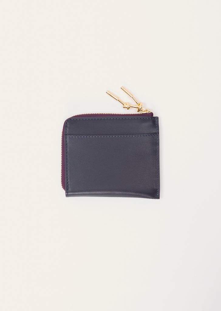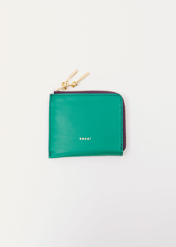 Sacai bicolor zip wallet with embossed logo and a gold-tone knots zipper pull in smooth leather. Features an external card slot, tonal interior and six interior card slots.