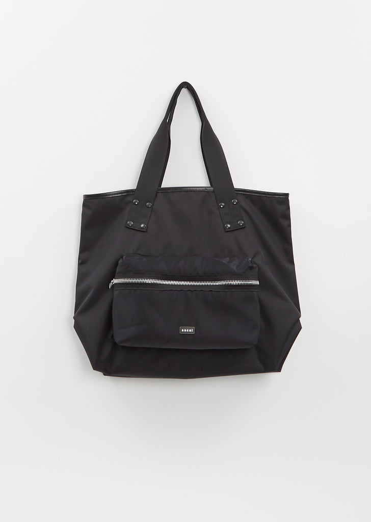 Sacai large tote bag with an open top and two rolled top handles in a black taffeta fabric. Features a leather trim, a single front large patch zip pocket with logo detail and a single interior patch pocket. Comes fully lined.
