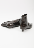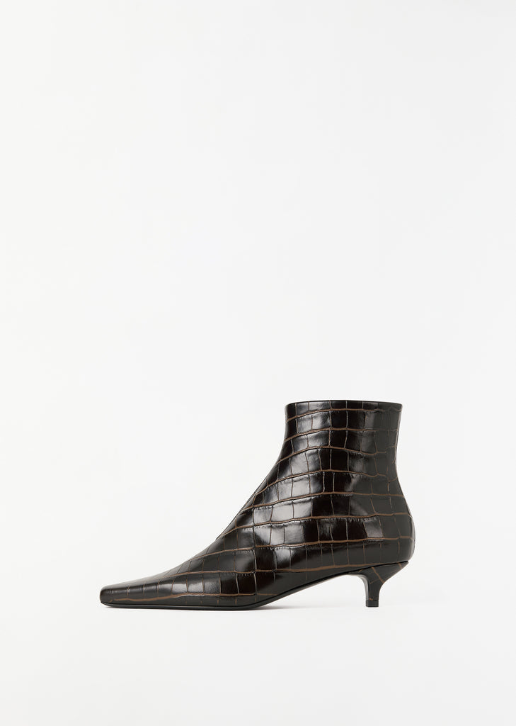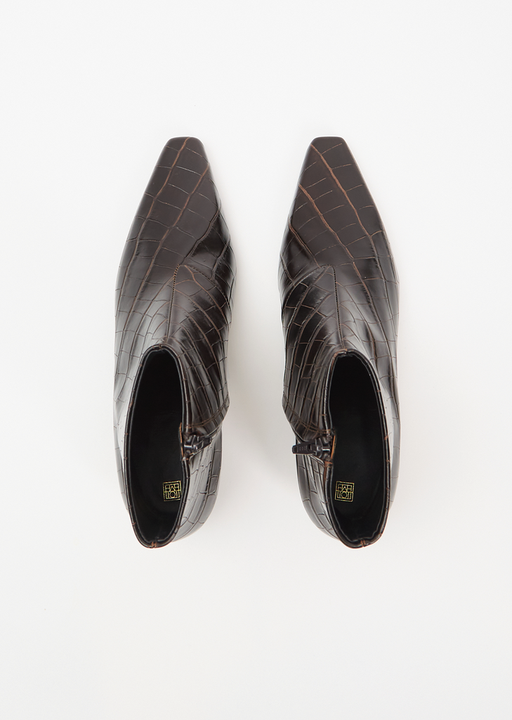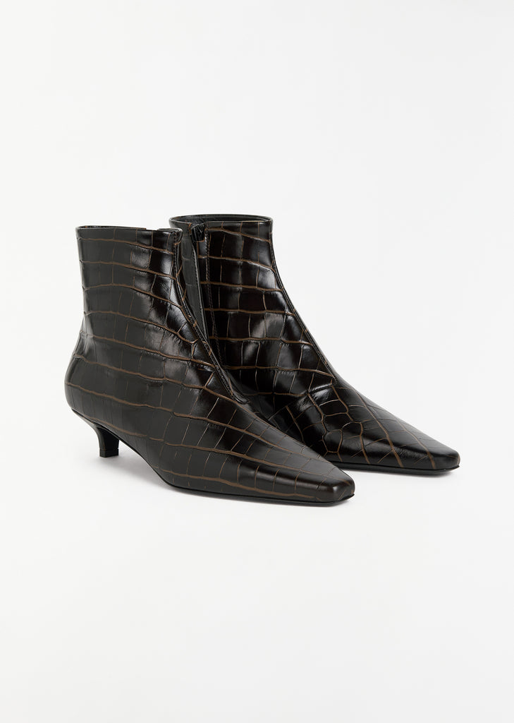 Totême dark brown ankle boot with a neatly paneled upper and squared off toe in croco-debossed calf leather.