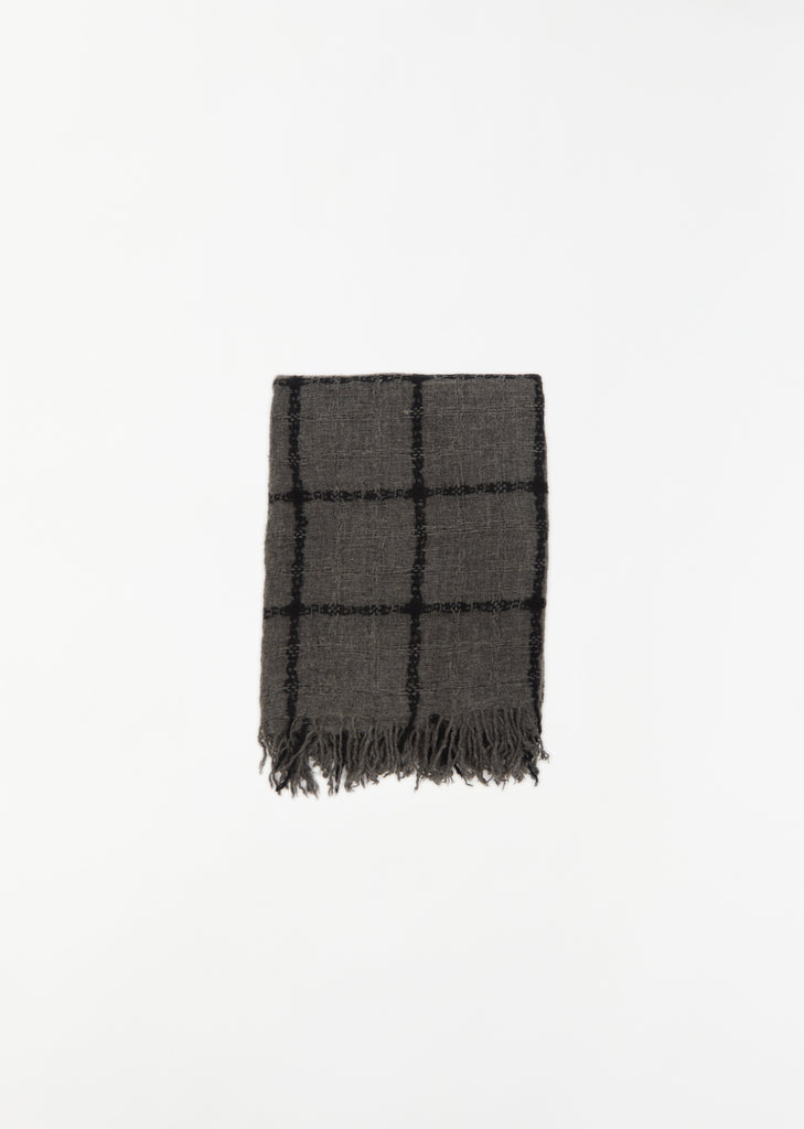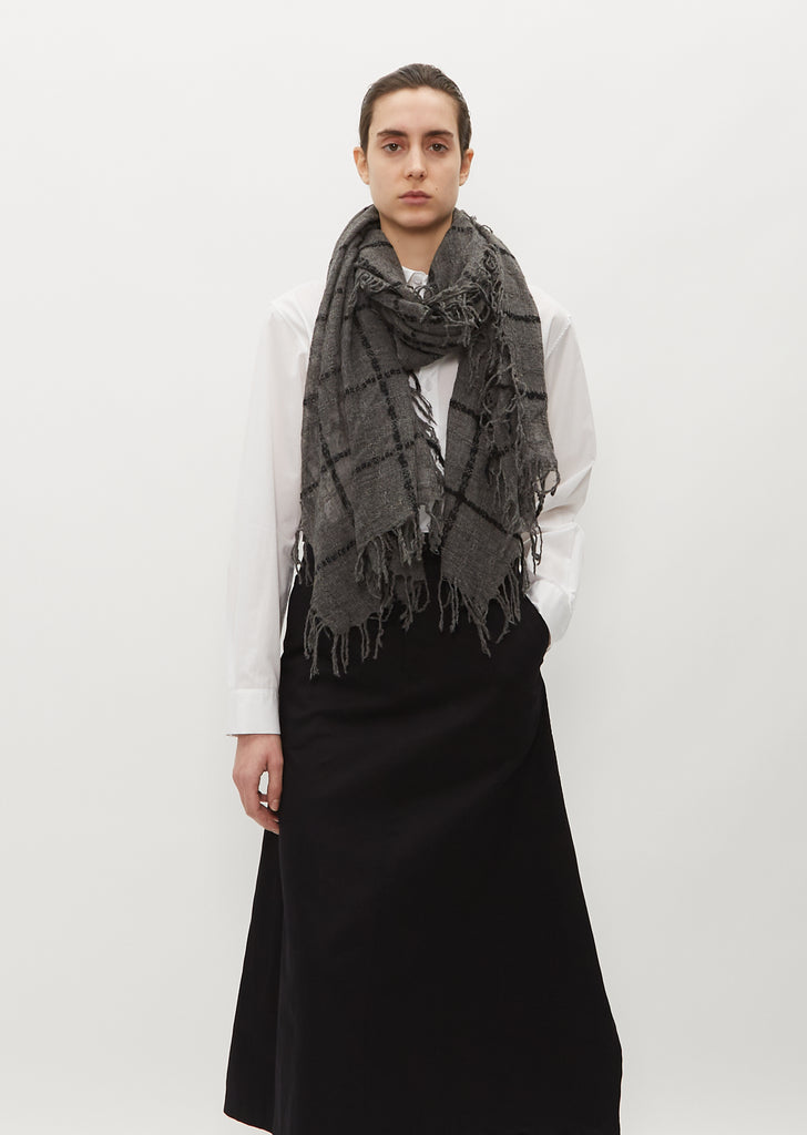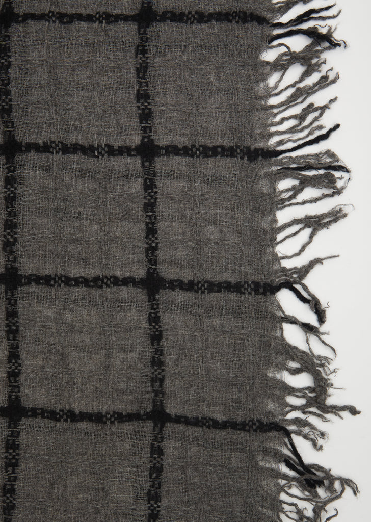 Y's by Yohji Yamamoto grey & black plaid scarf with a rectangular shape knitted in mid-gauge cashmere gauze. Finished with fringe trim at all sides.