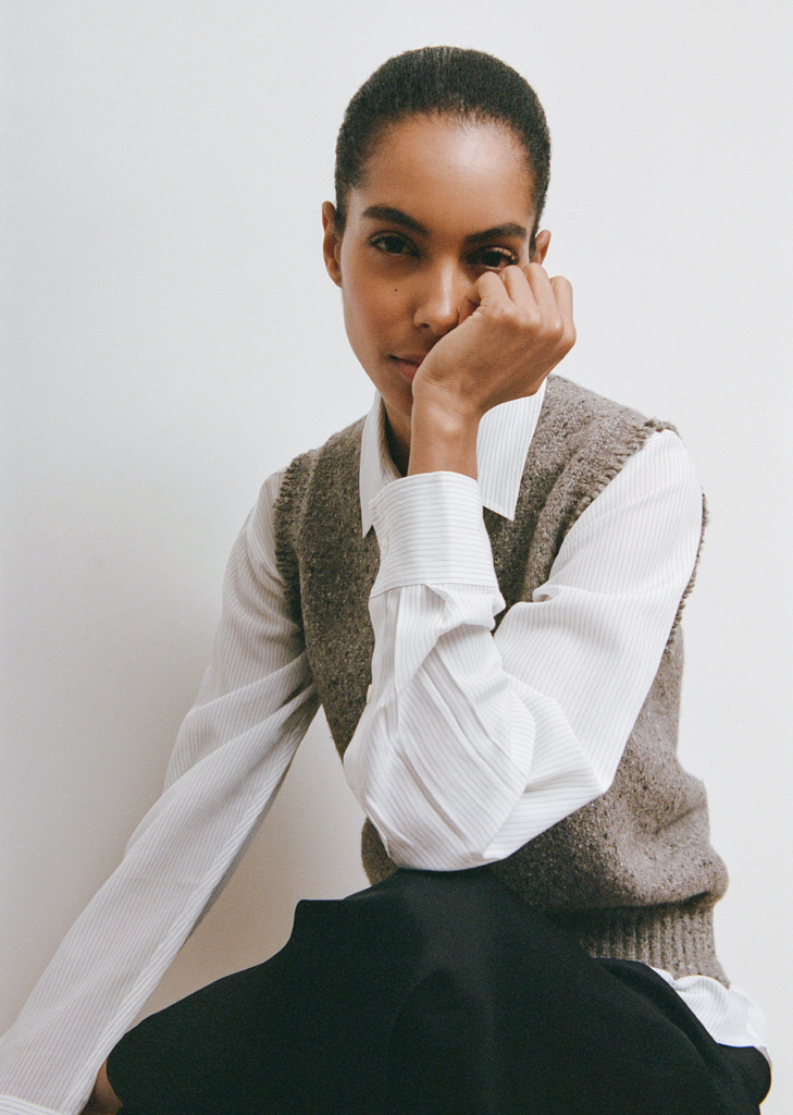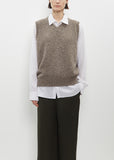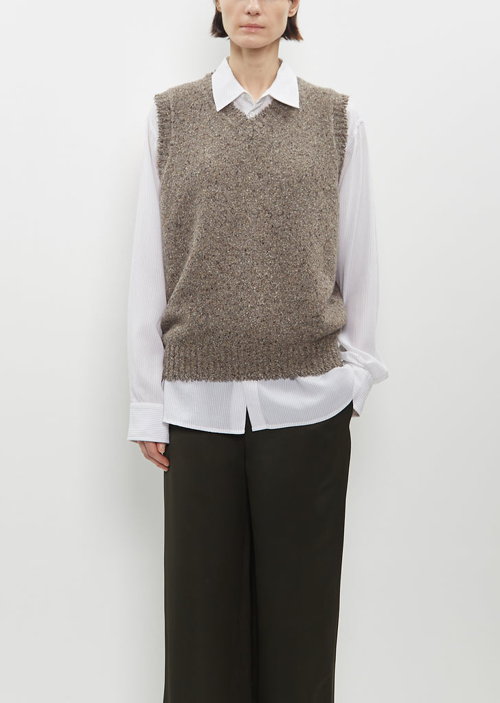 6397 grey brown vest with a high V-neck and raw edge finishings throughout mid-weight in wool blend knit. Features rib trim at neckline, armholes, and hem.